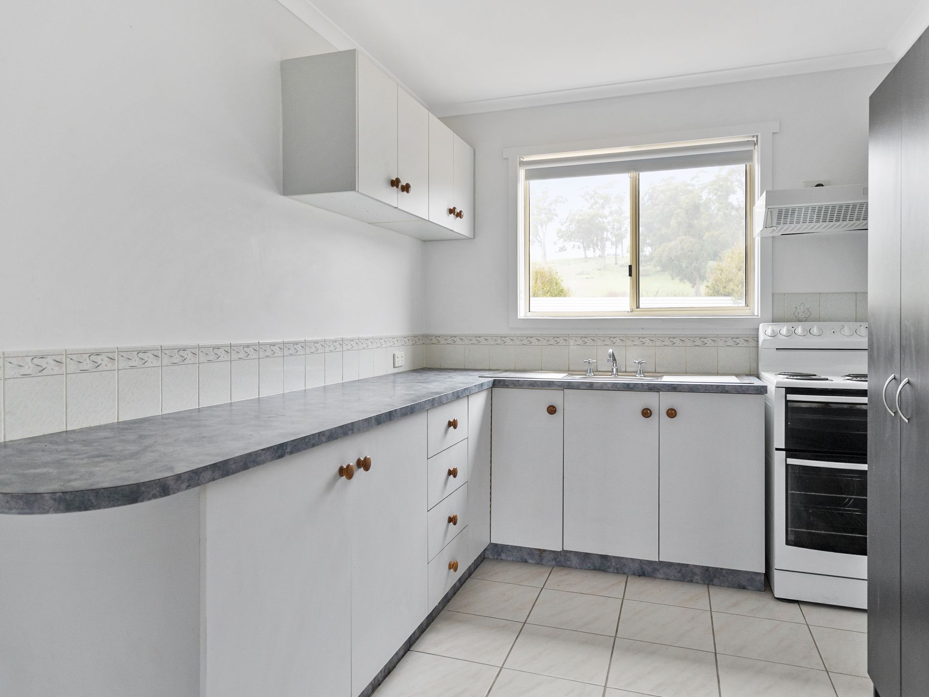 Fans throughout keep the property cool in summer, and a newly installed heat pump will keep the home warm for the winter months. The tiled kitchen is well appointed, with overhead cabinets, a large fridge recess, and freestanding cooker.