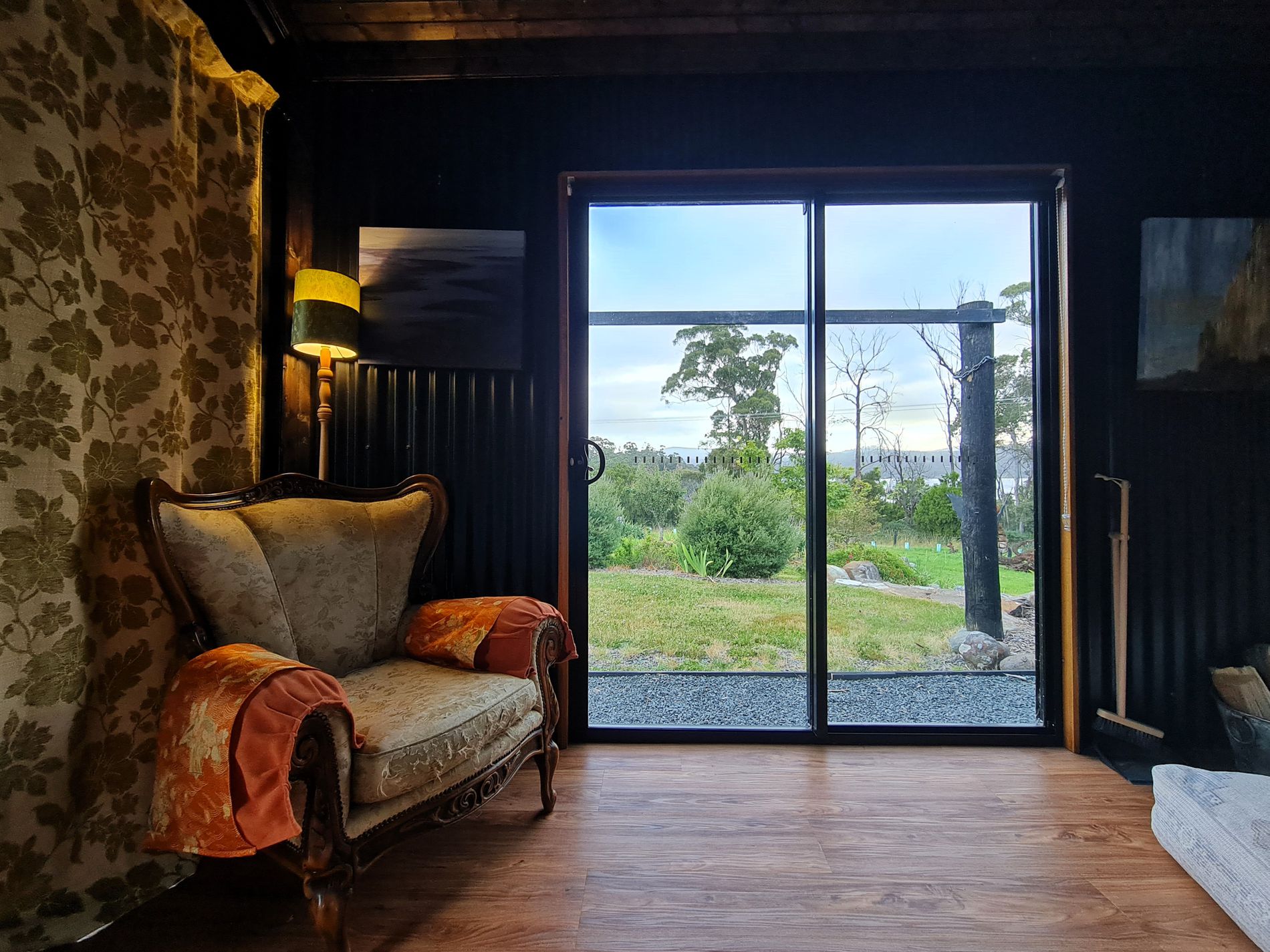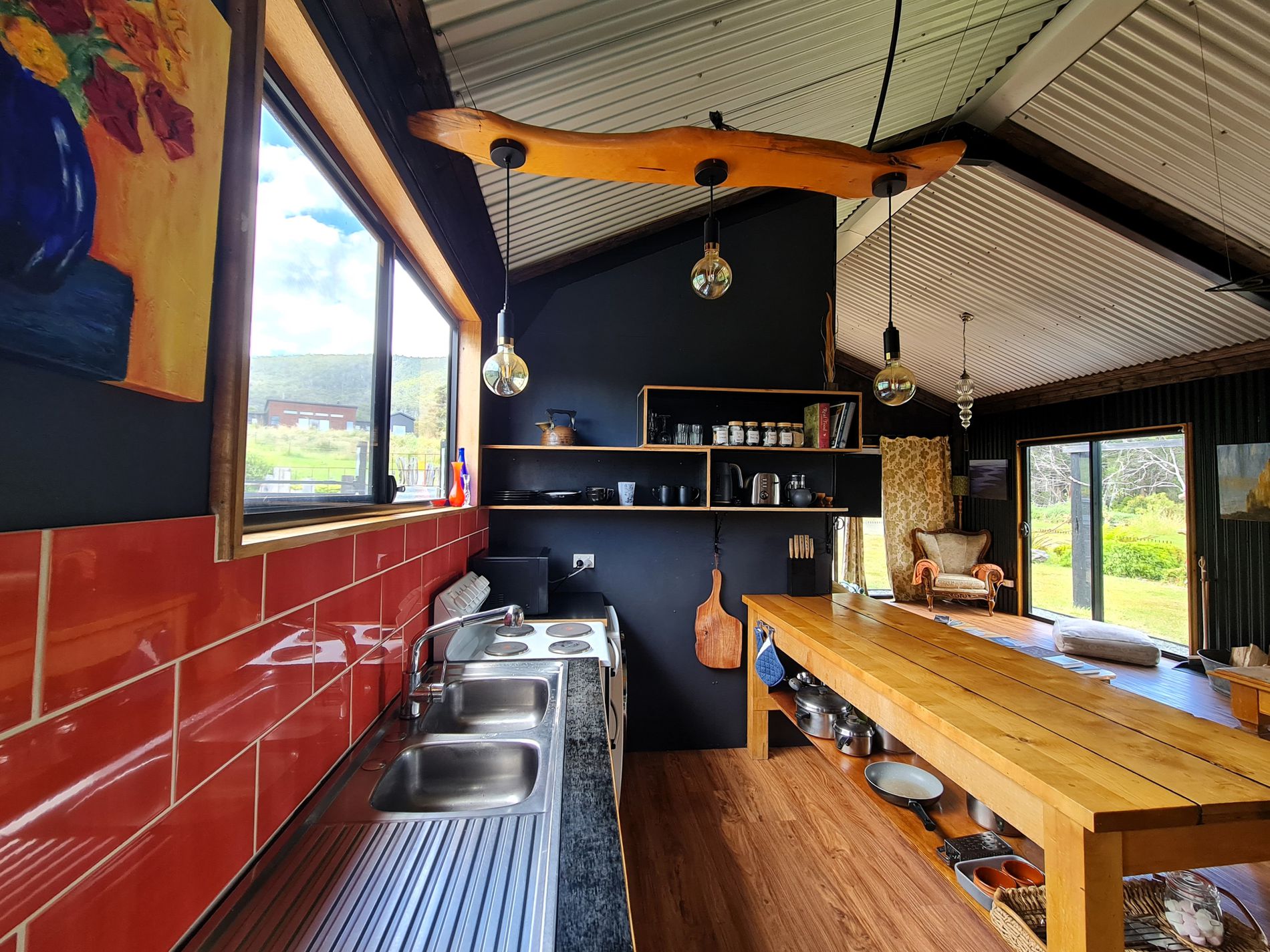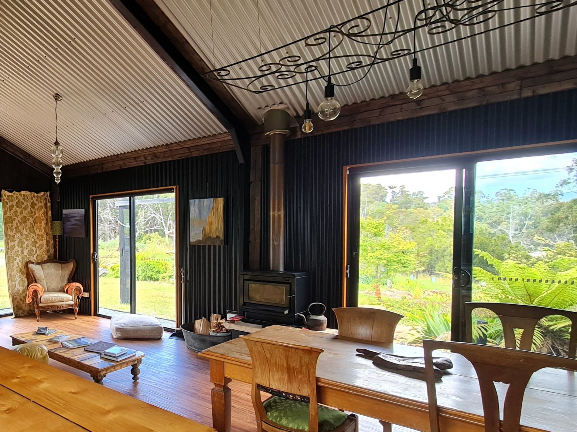 The exterior and interior design of the home is based on a black palette and affords the perfect backdrop to showcase the coastal environment and landscaped gardens. The open plan living and dining room looks out to the river and beautiful surrounding gardens. A fully equipped kitchen includes full size fridge, freestanding stove and oven. The area has been stylishly decorated and offers something truly spectacular. The area is kept warm with a wood fire for the cooler months.