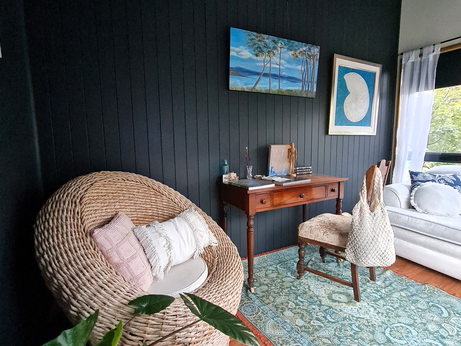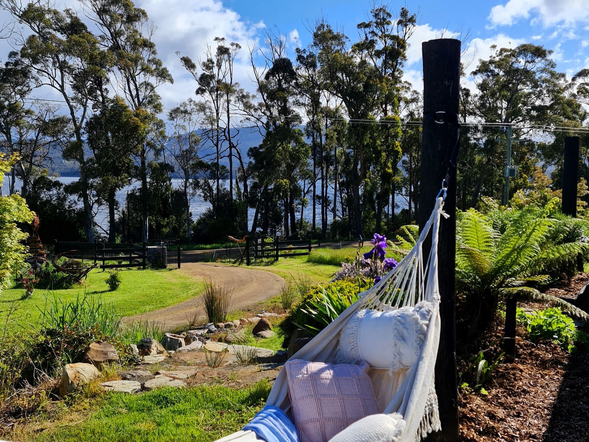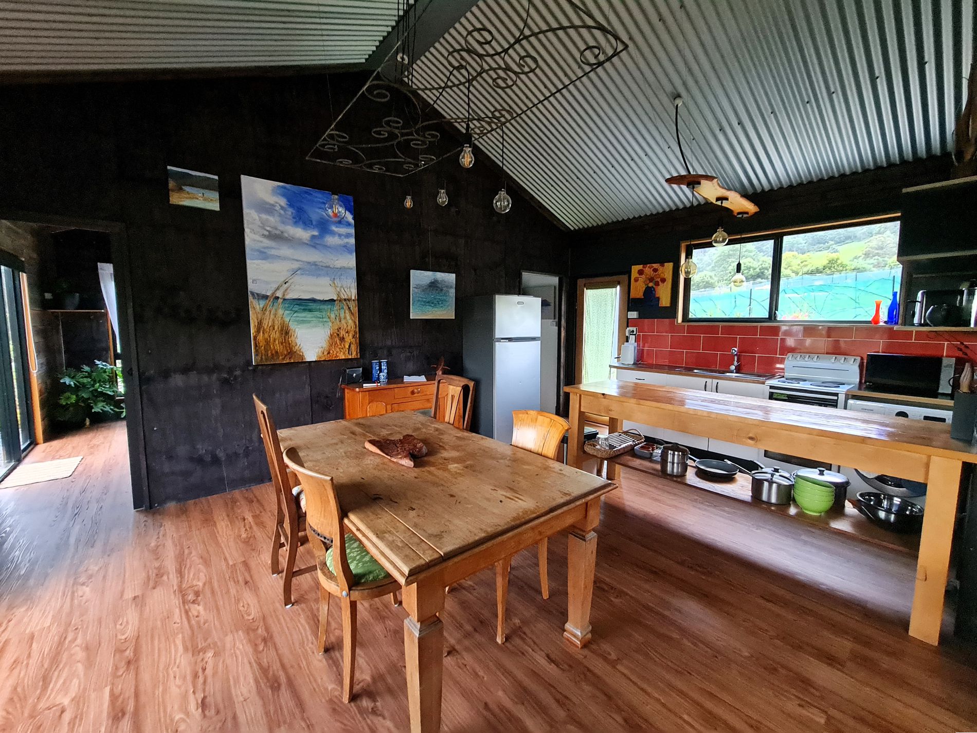 The exterior and interior design of the home is based on a black palette and affords the perfect backdrop to showcase the coastal environment and landscaped gardens. The open plan living and dining room looks out to the river and beautiful surrounding gardens. A fully equipped kitchen includes full size fridge, freestanding stove and oven. The area has been stylishly decorated and offers something truly spectacular. The area is kept warm with a wood fire for the cooler months.