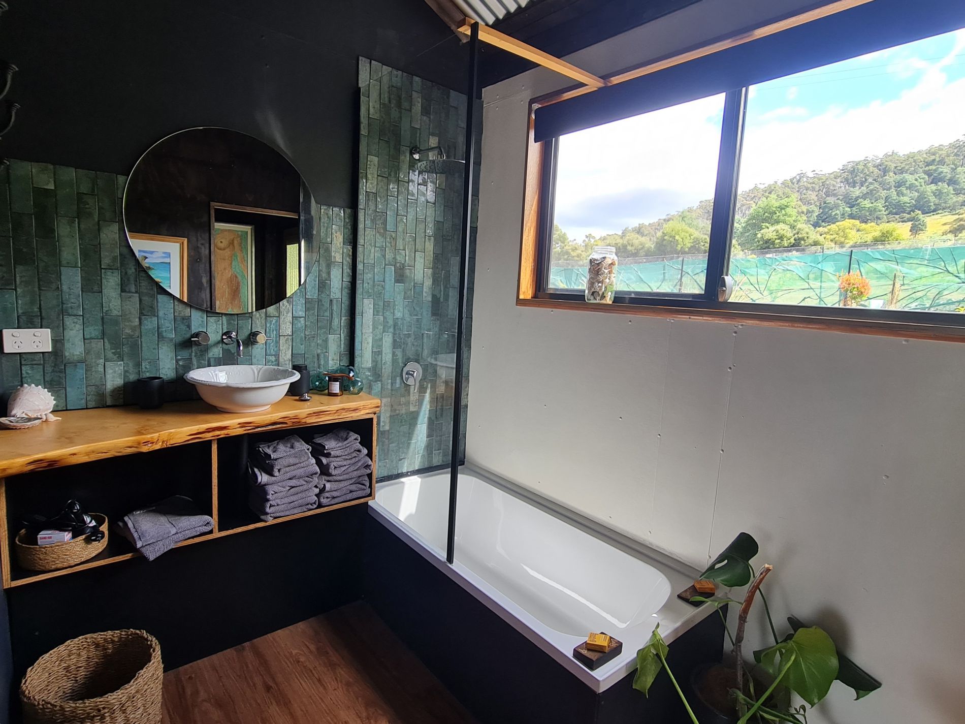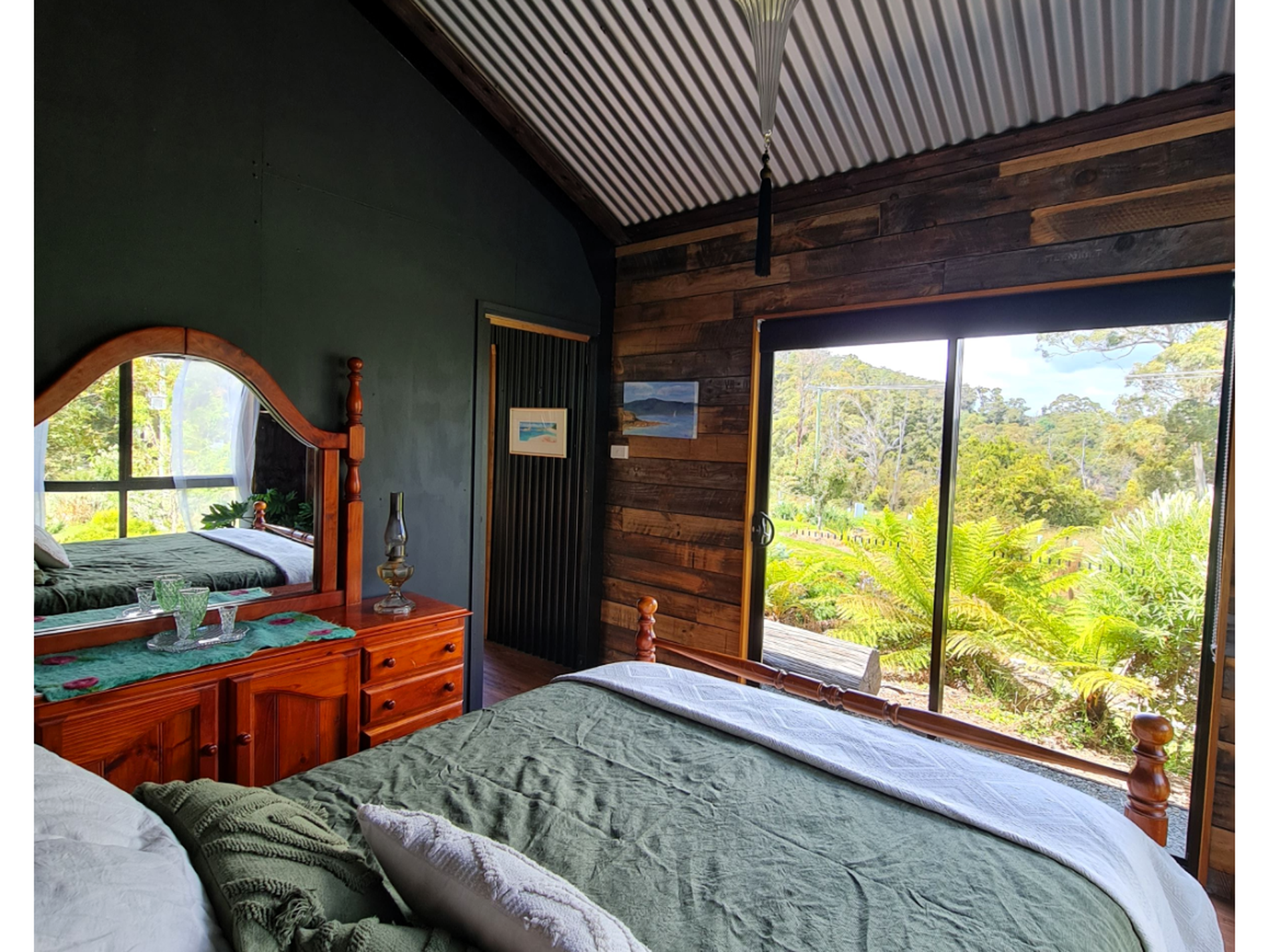 The spacious queen bedroom with riverfront views has been tastefully decorated to provide a truly comfortable space with rustic timber textures. The second room is furnished as a beautiful sitting room that can be utilized as an office or reading room. There is the possibility of this being furnished as a second bedroom if required. The beautifully appointed bathroom with shower-bath and bespoke Huon Pine vanity is the perfect place to soak and relax.