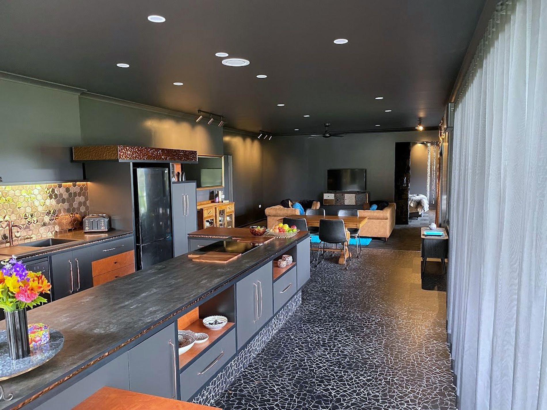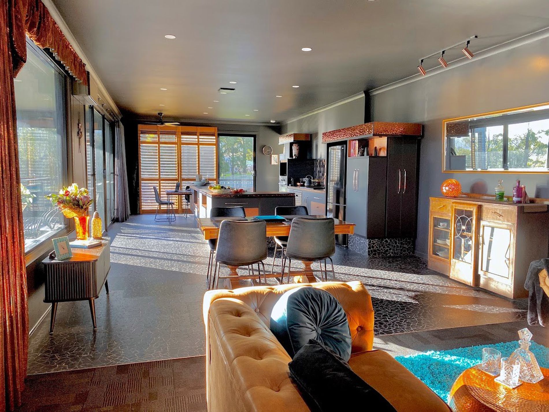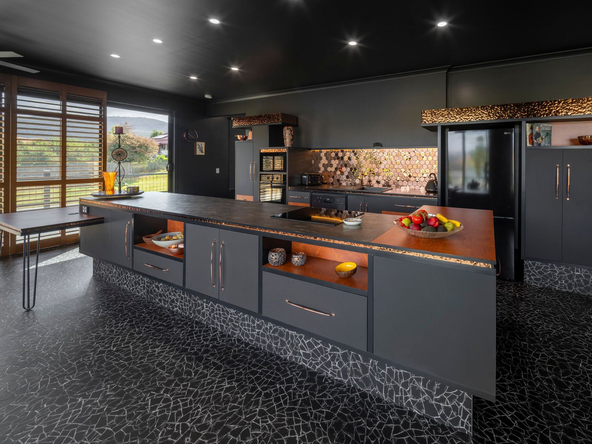 The open plan kitchen, dining lounge with its deep-coloured cabinetry and copper highlights, has absolutely stunning views over Port Cygnet Bay. From here, you can access either one of the spacious decks; the open patio has a built-in bar overlooking the bay and the covered entertaining area at the front of the home is an exceptional spot to gather with friends.