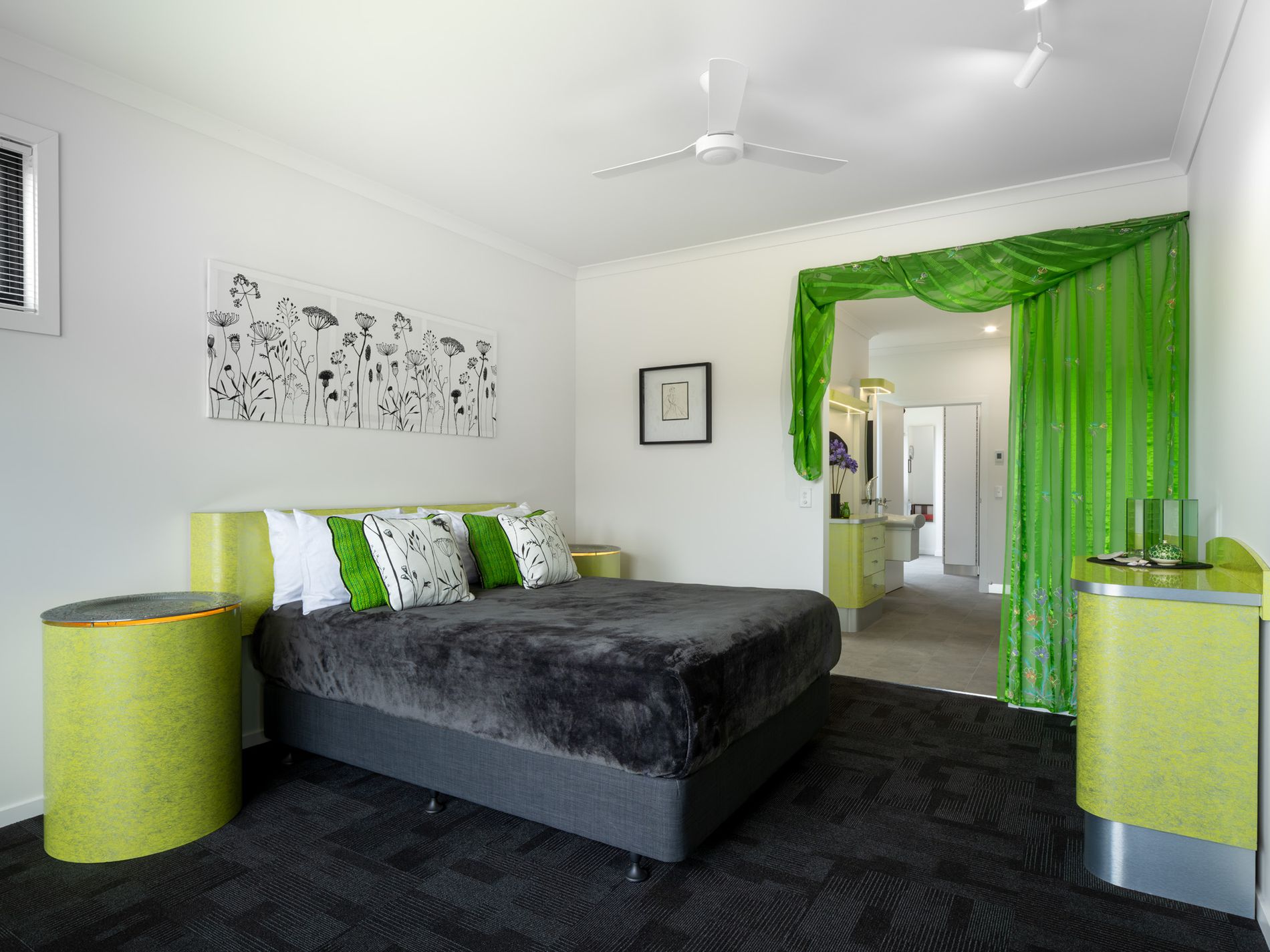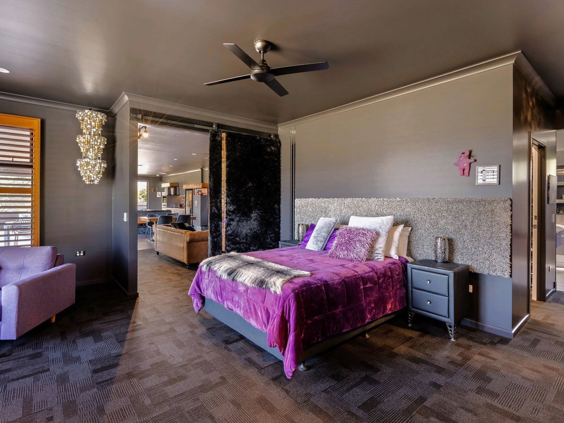 Pops of fun and fantasy are found throughout the home, along with surprising details designed to delight. From copper curtains to intricate door handles and textured wide doorways, each element of this property was thoughtfully considered and perfectly executed. It’s been designed and set high to easily accommodate future additional bedrooms and garages underneath should you find you need more space.