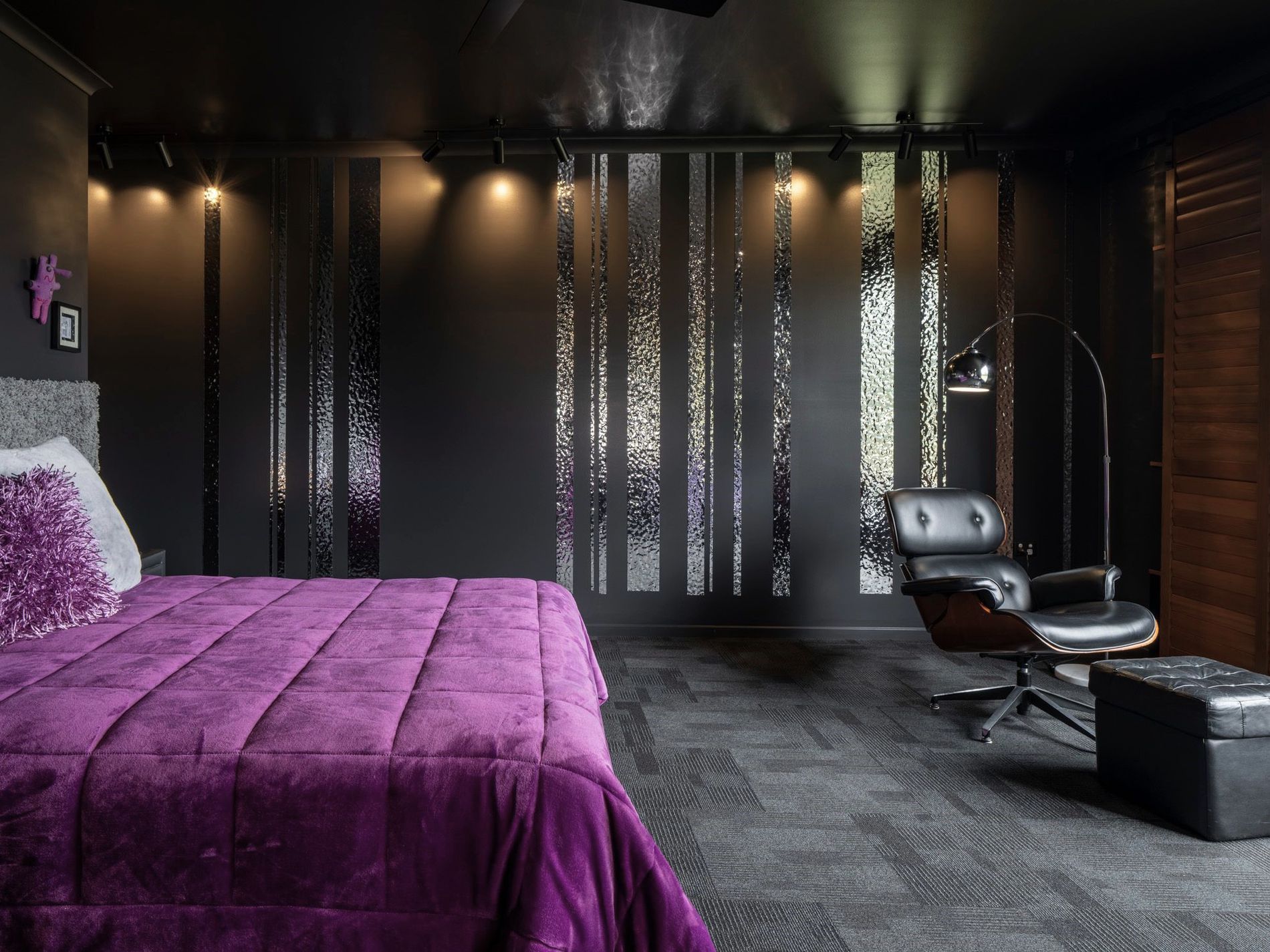 The moodier bedroom at the other end of the house is wrapped in deep shades of black which allow the water views to take centre stage. This suite provides a separate large walk-in wardrobe, as well as its own underfloor heated ensuite and dressing room.