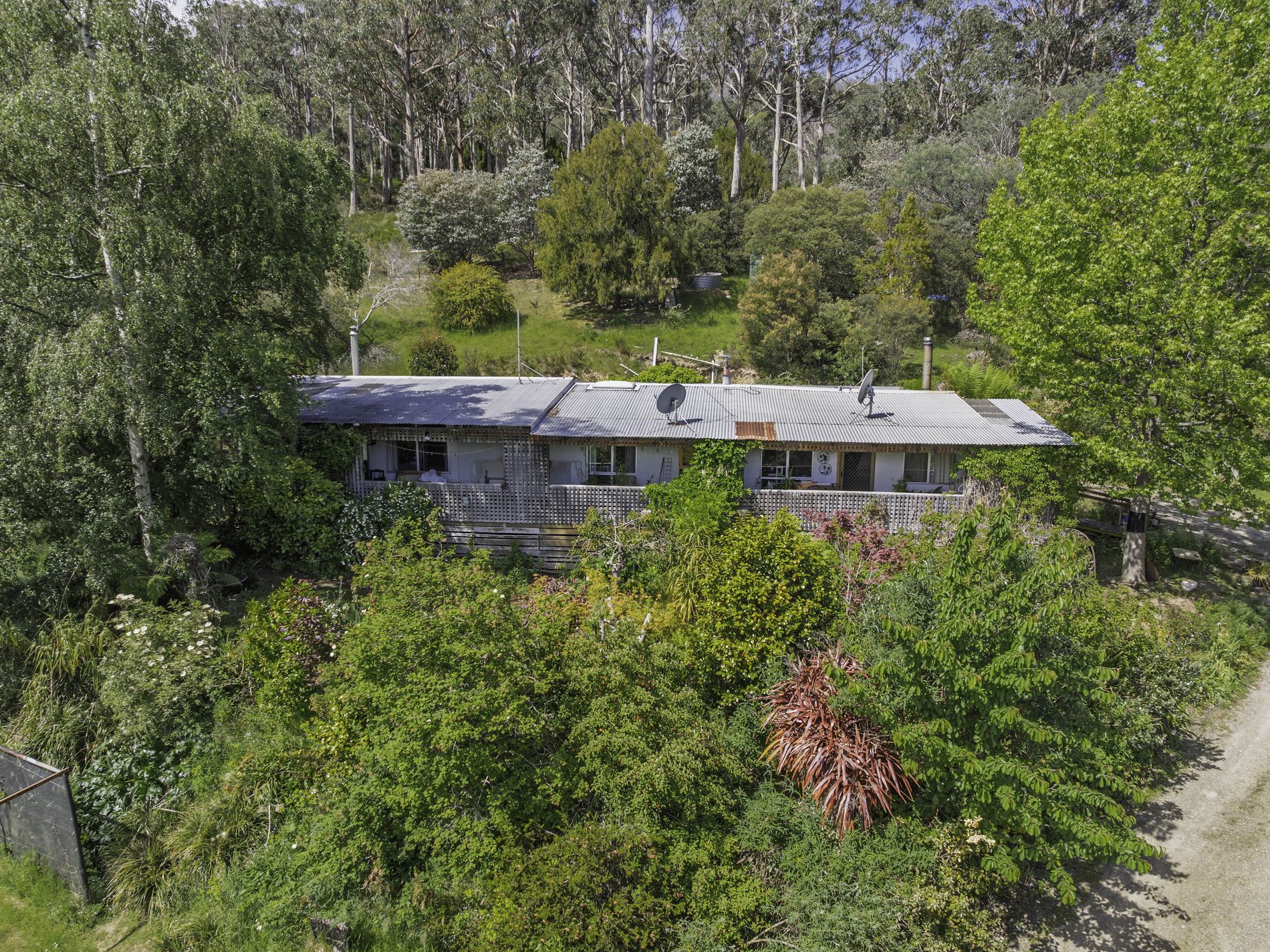 The residence boasts four spacious bedrooms, two living areas, both with wood heating, a family bathroom, and a combined open-plan kitchen, dining, and family room. Adding to the versatility is a large, partially enclosed entertainer's hideaway—an ideal space for creating lasting family memories. Enjoy the distant valley views from the covered sun deck, which seamlessly integrates with the surrounding gardens. While the home is in need of some finishing touches, the opportunity to personalize it to your liking is an exciting prospect.