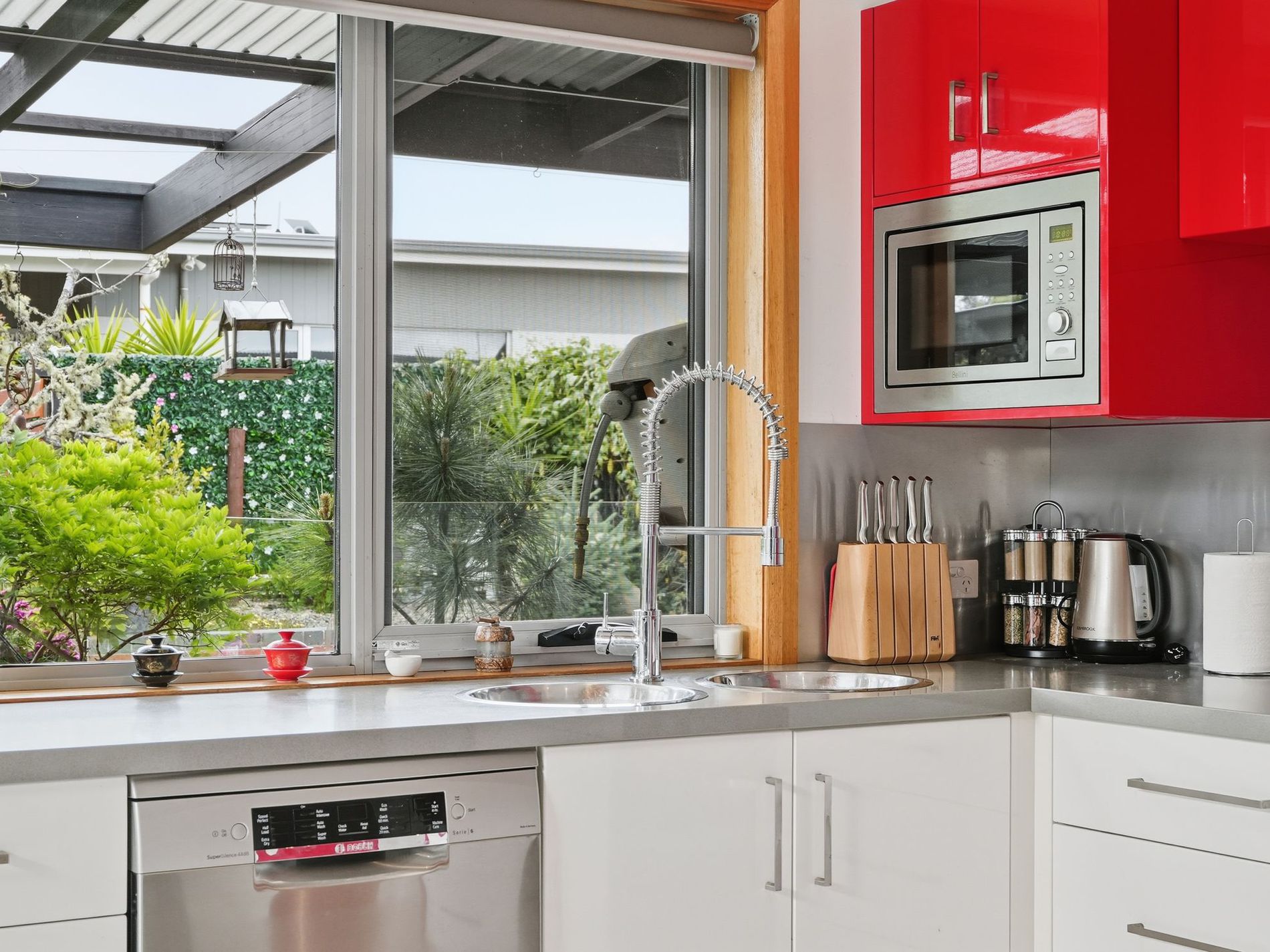 There are two options for dining, a formal space in the lounge and a more casual space, perfectly positioned beside the kitchen so meals, homework and conversation happen all in one place. The kitchen is open and spacious, with a splash of red and loads of storage.