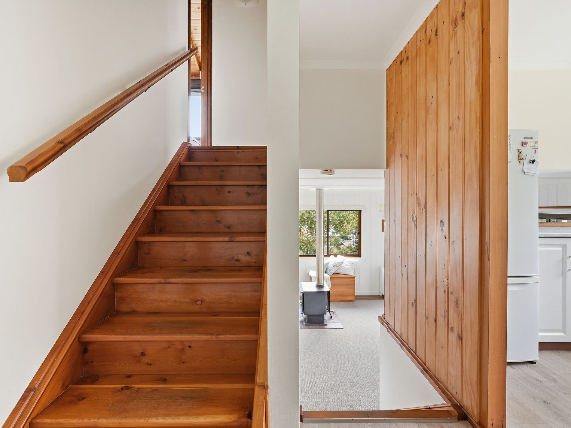 The two generous bedrooms enjoy the upper level, which is beautifully warmed by the wood heater flue, creating a snug, restful space.