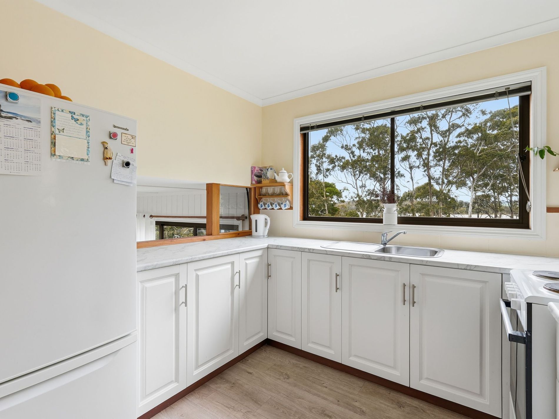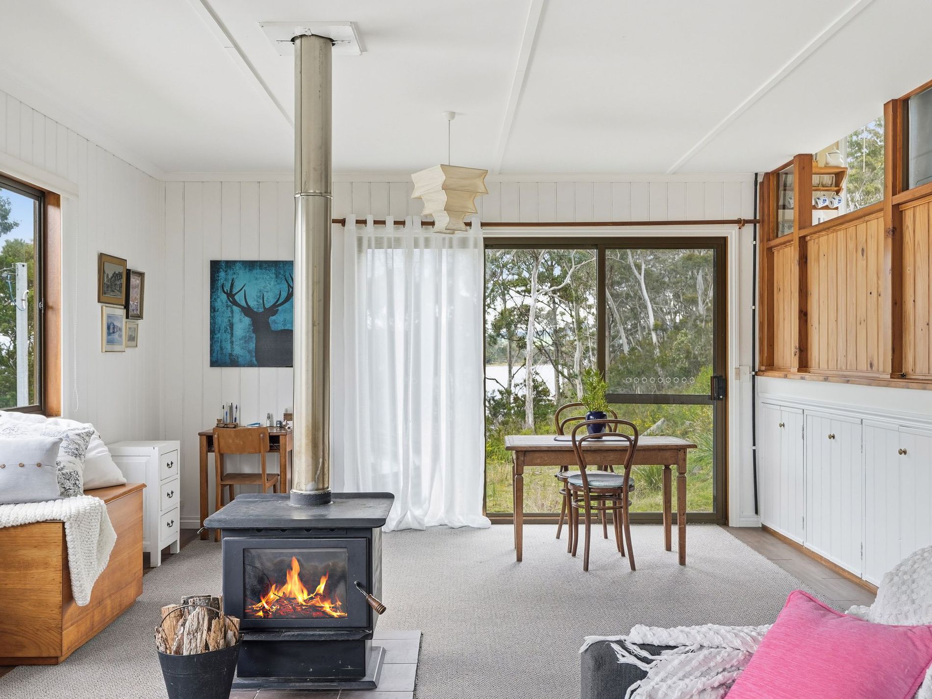You’ll find the generously sized living and dining area, with an abundance of storage, on the lower level, which is drenched in morning sunlight and boasts sweeping views of the water. The wood heater sits centrally here, creating radiant warmth through each season.