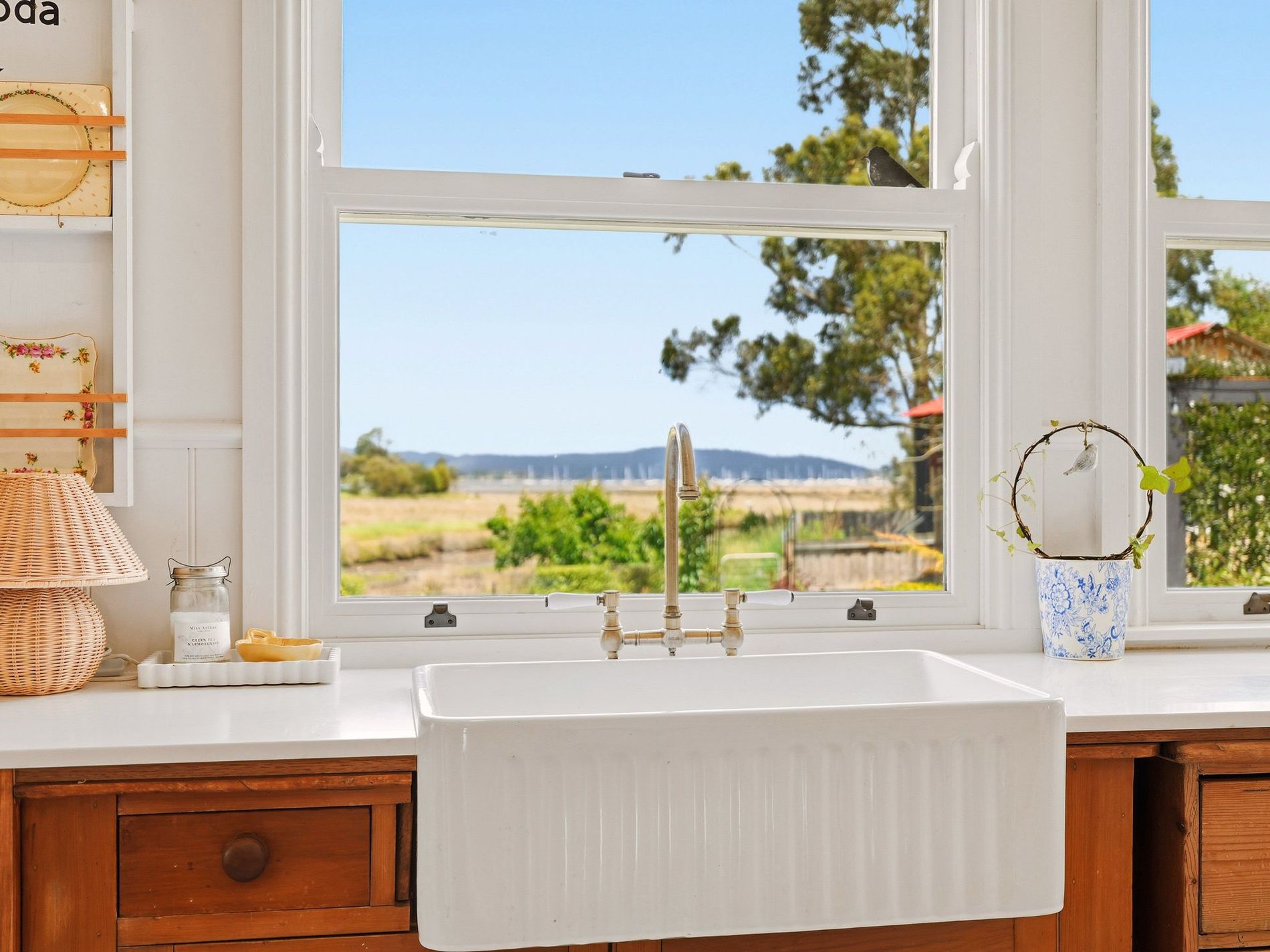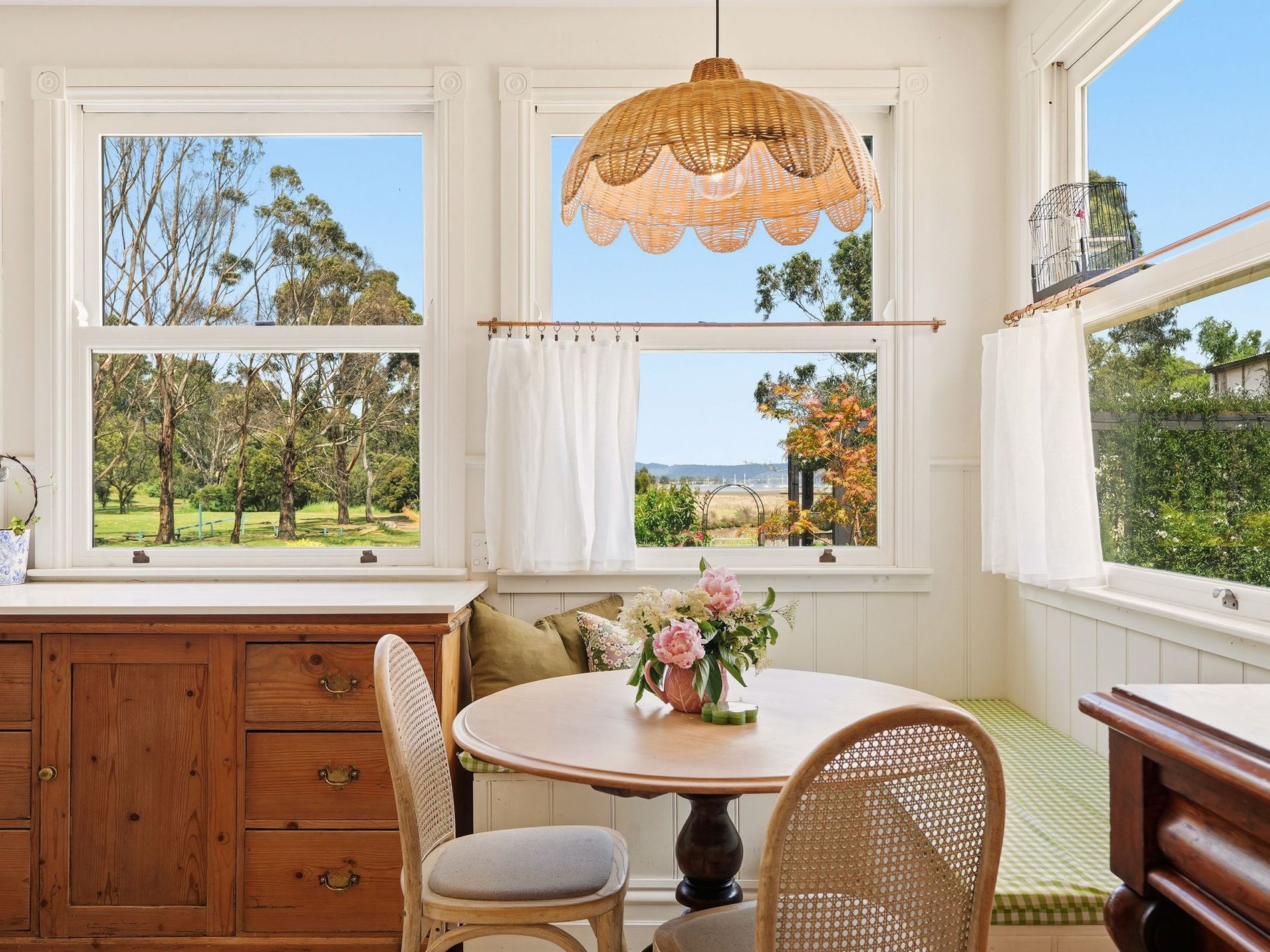 The kitchen and dining area have been sympathetically rebuilt, now offering tranquil water views across Burtons Reserve, Port Cygnet, and the local sailing club.