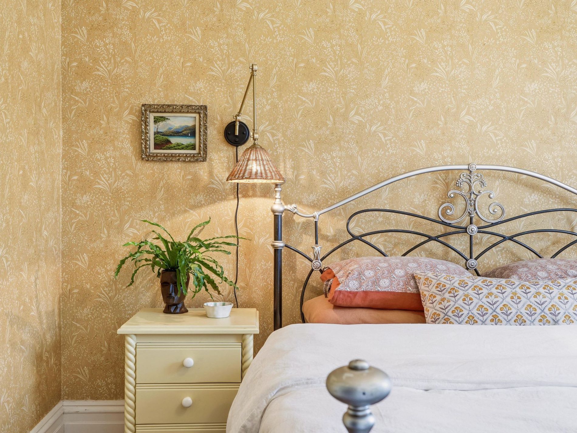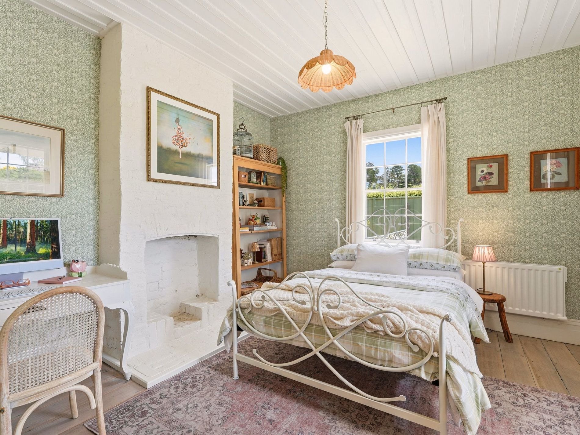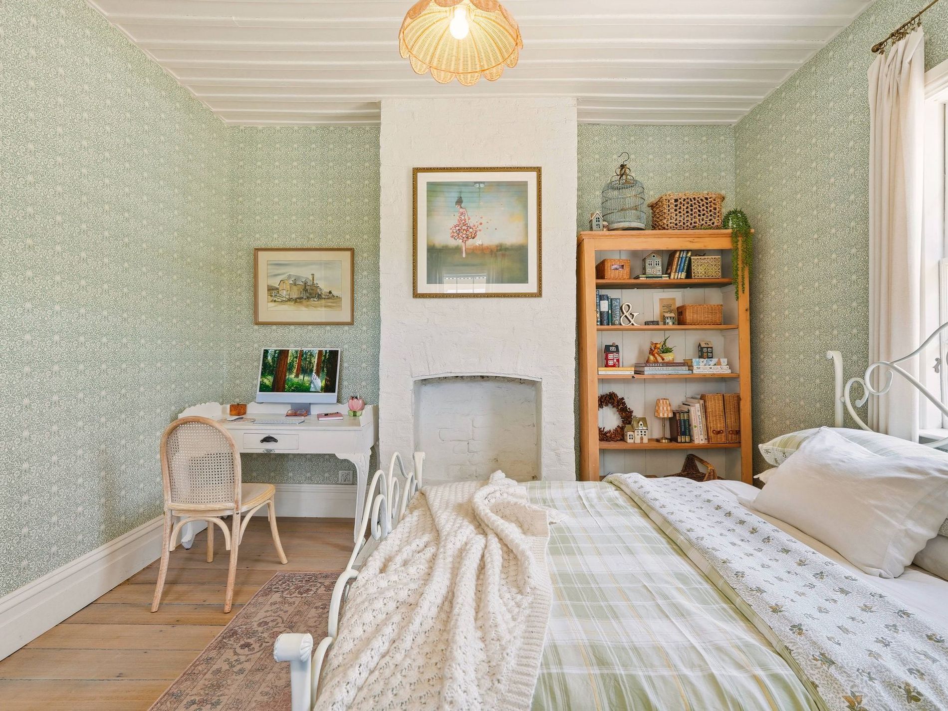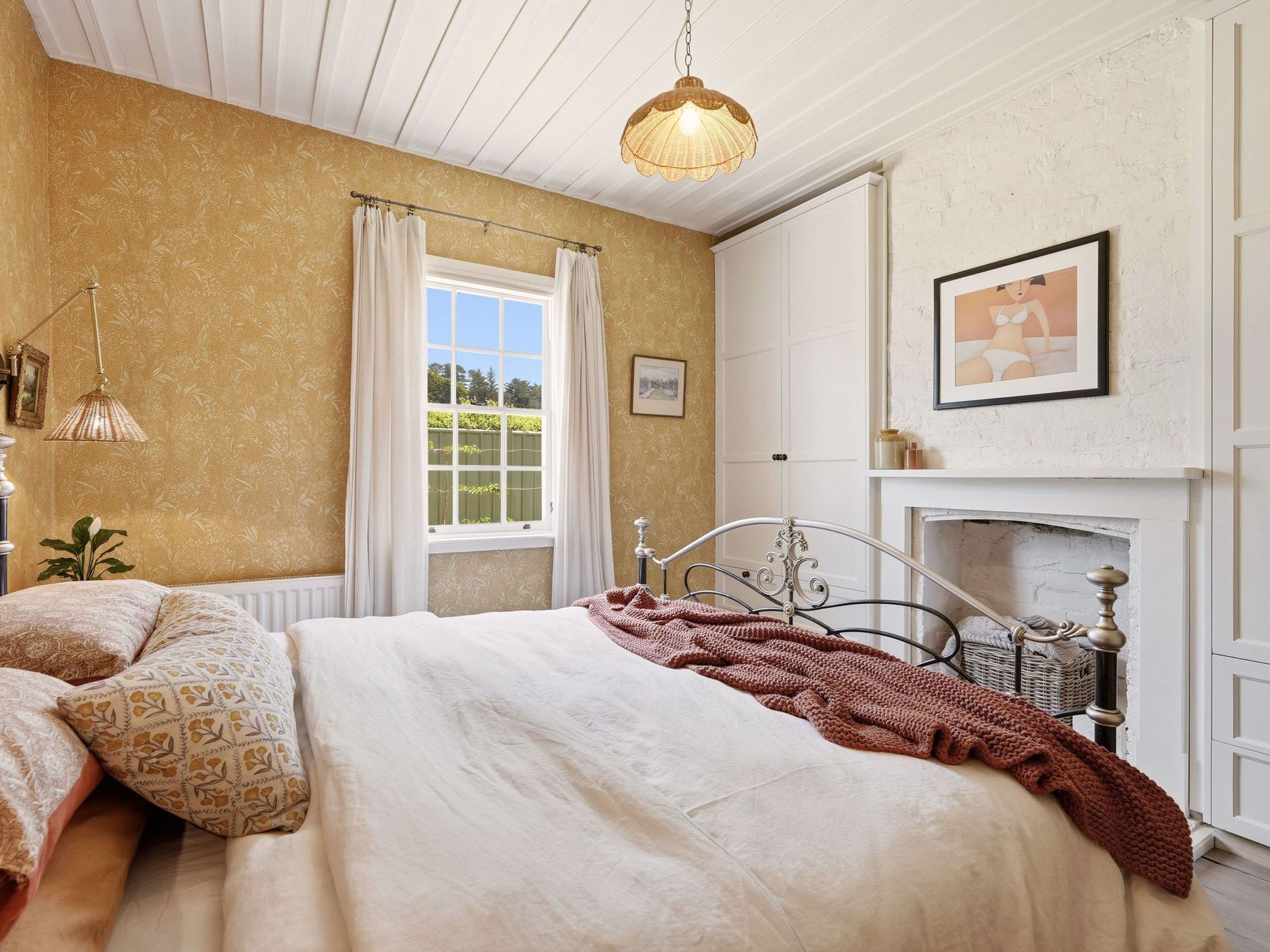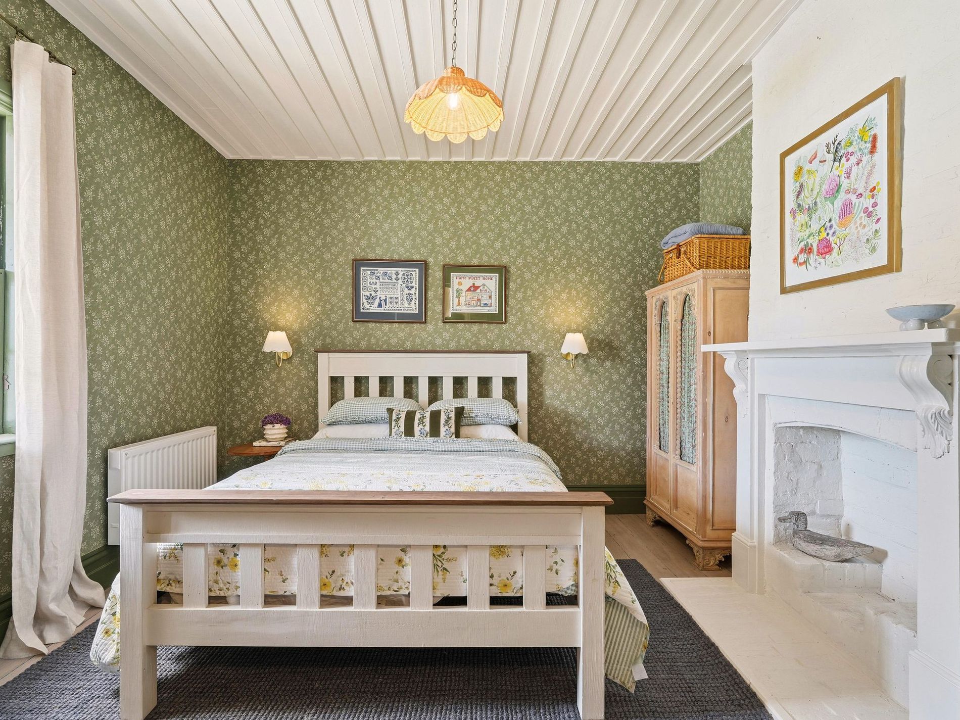 The traditional floor plan has been thoughtfully maintained, with three bedrooms opening off the central entrance hall. Each room still boasts the 1880s brick chimneys and has been finished with quality wallpaper, chosen to match the original samples found during the restoration. The living room offers the same and is snugly positioned right in the heart of the home. Thermosoft radiators heat the cottage with gentle warmth and help to maintain an inviting atmosphere year-round.
