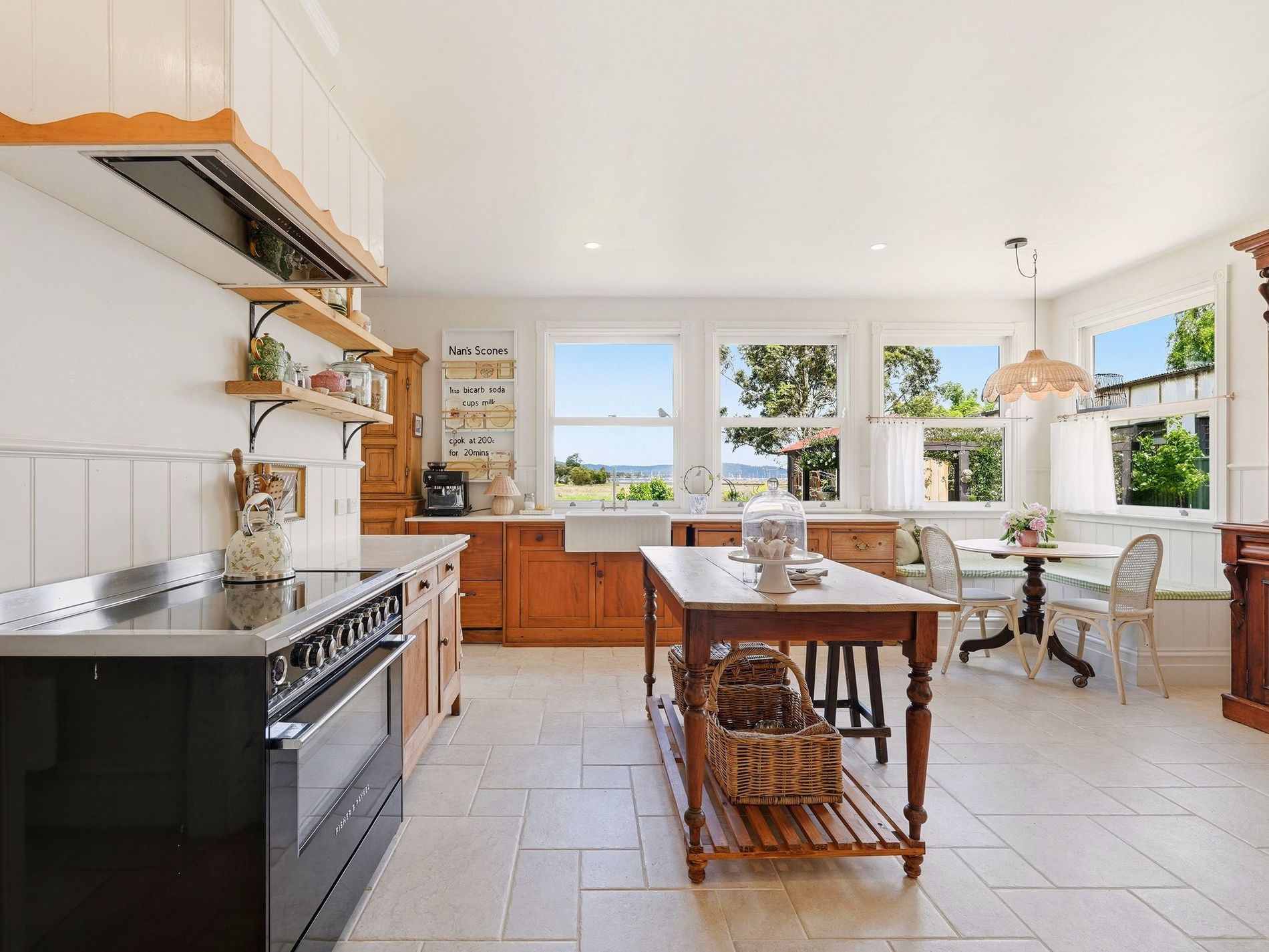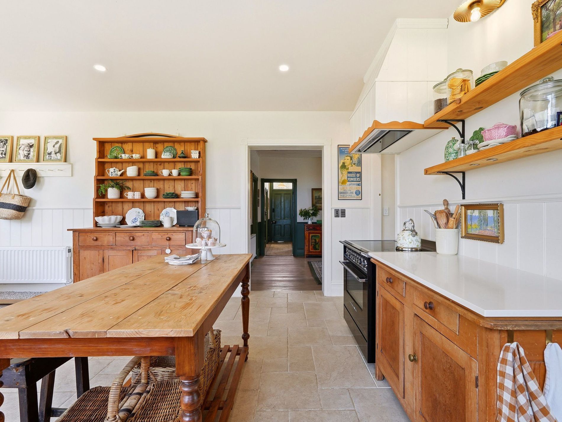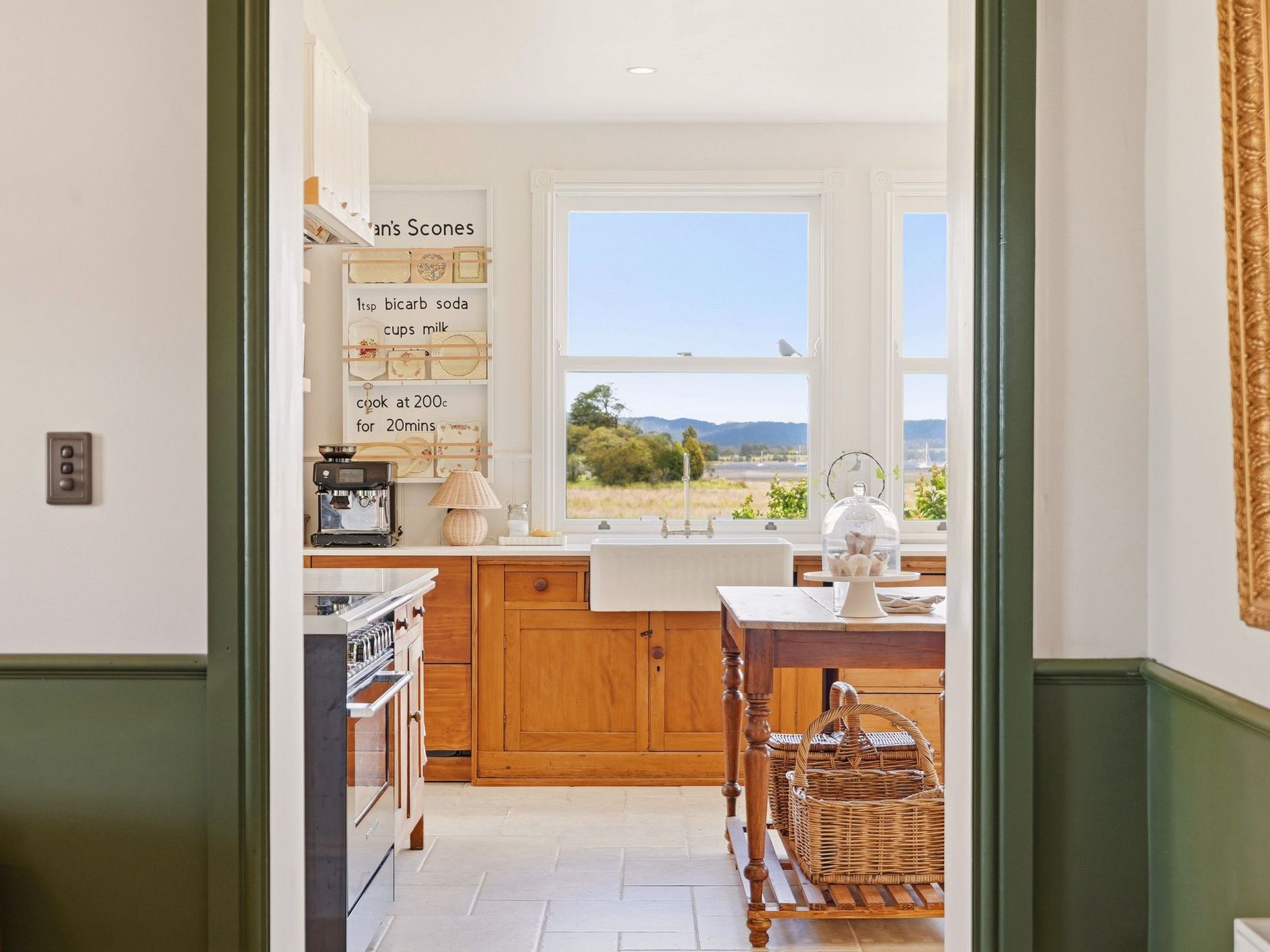 French-lay tiles meet beautifully curated, antique cabinetry, finished with stone benchtops and a classic farmhouse sink. There is an integrated dishwasher and a gorgeous freestanding cooker, making this space as functional as it is beautiful.