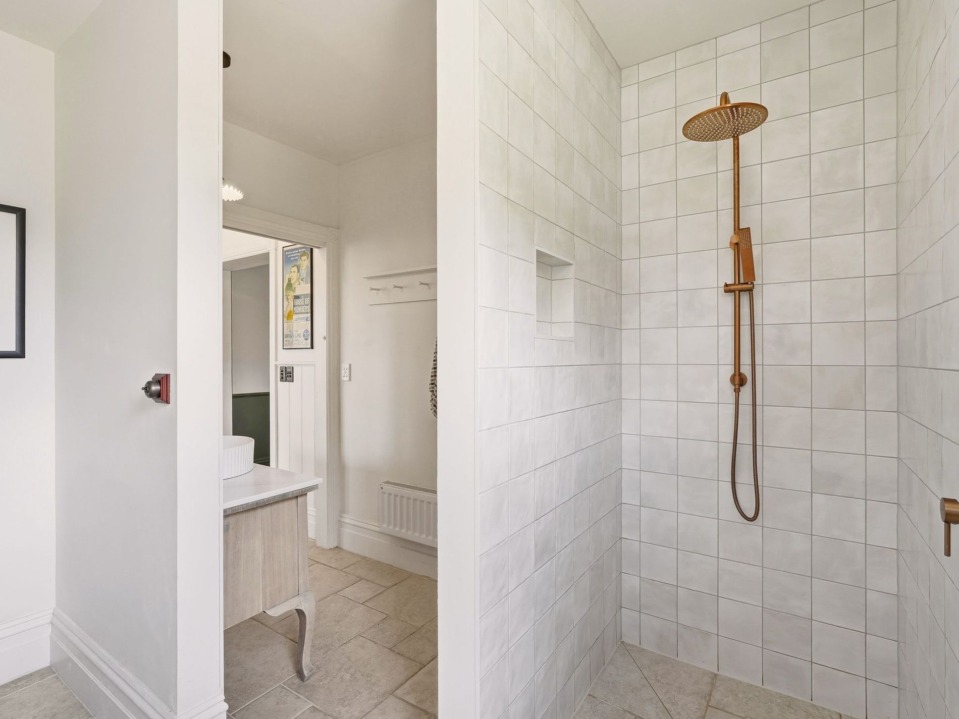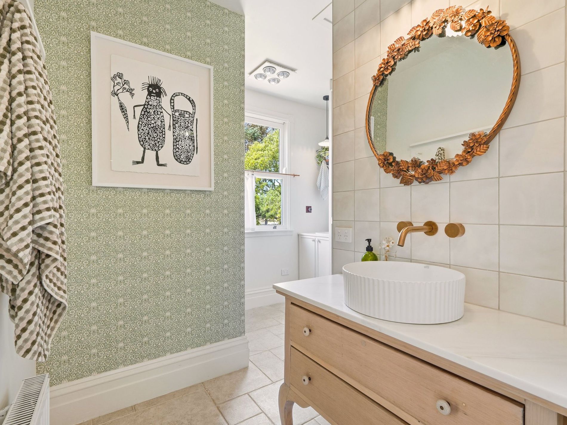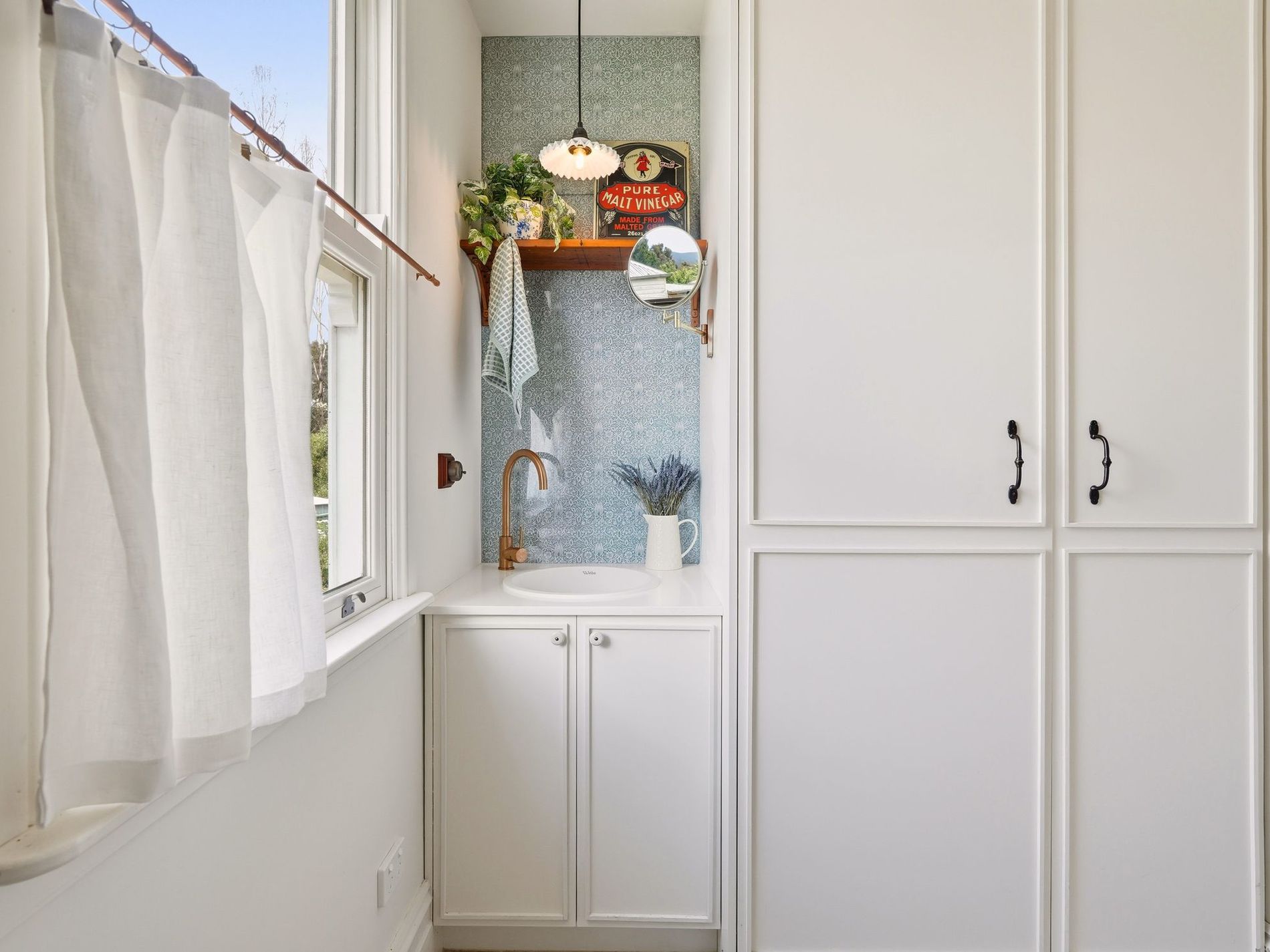 French-lay tiles meet beautifully curated, antique cabinetry, finished with stone benchtops and a classic farmhouse sink. There is an integrated dishwasher and a gorgeous freestanding cooker, making this space as functional as it is beautiful.