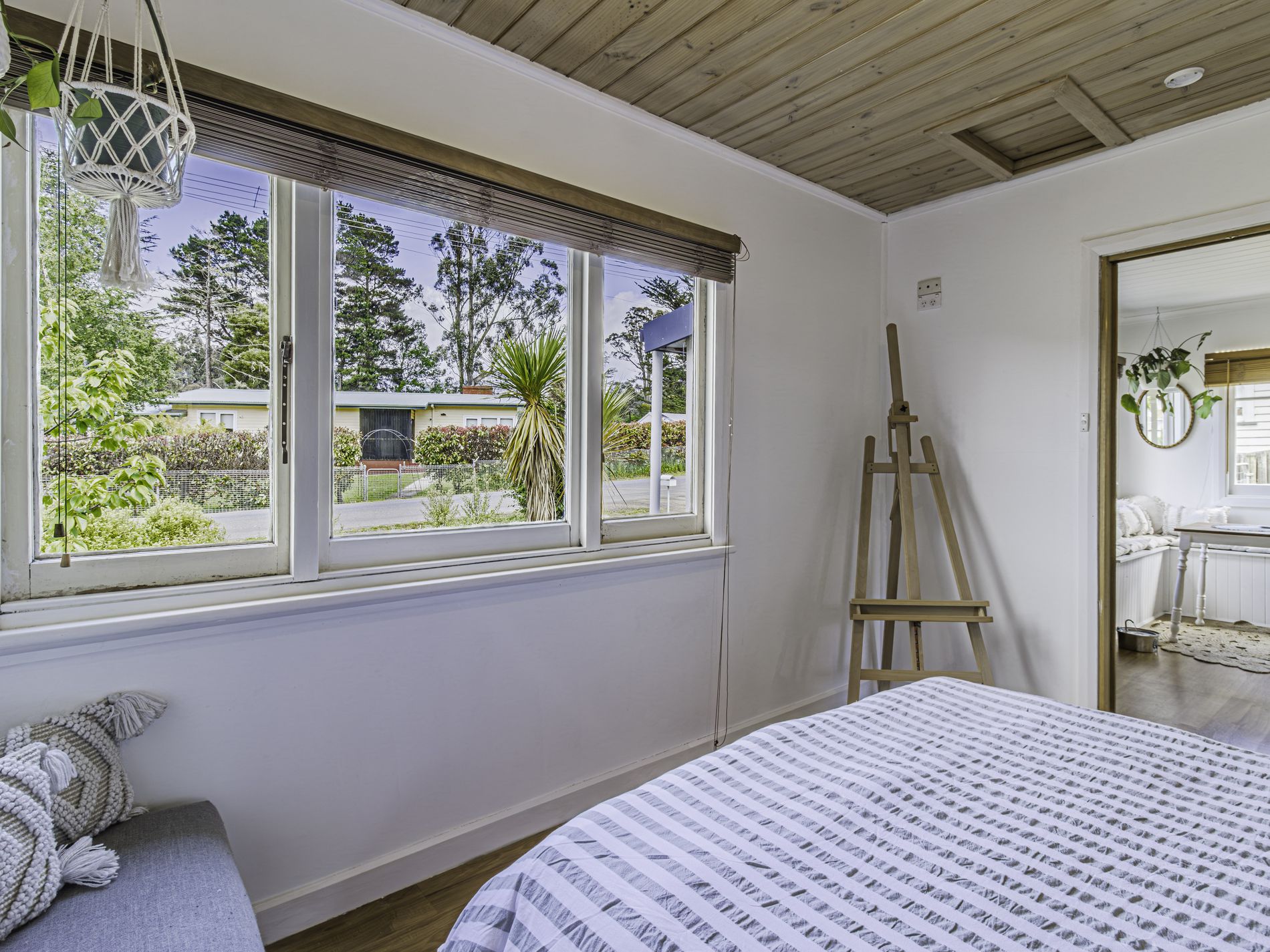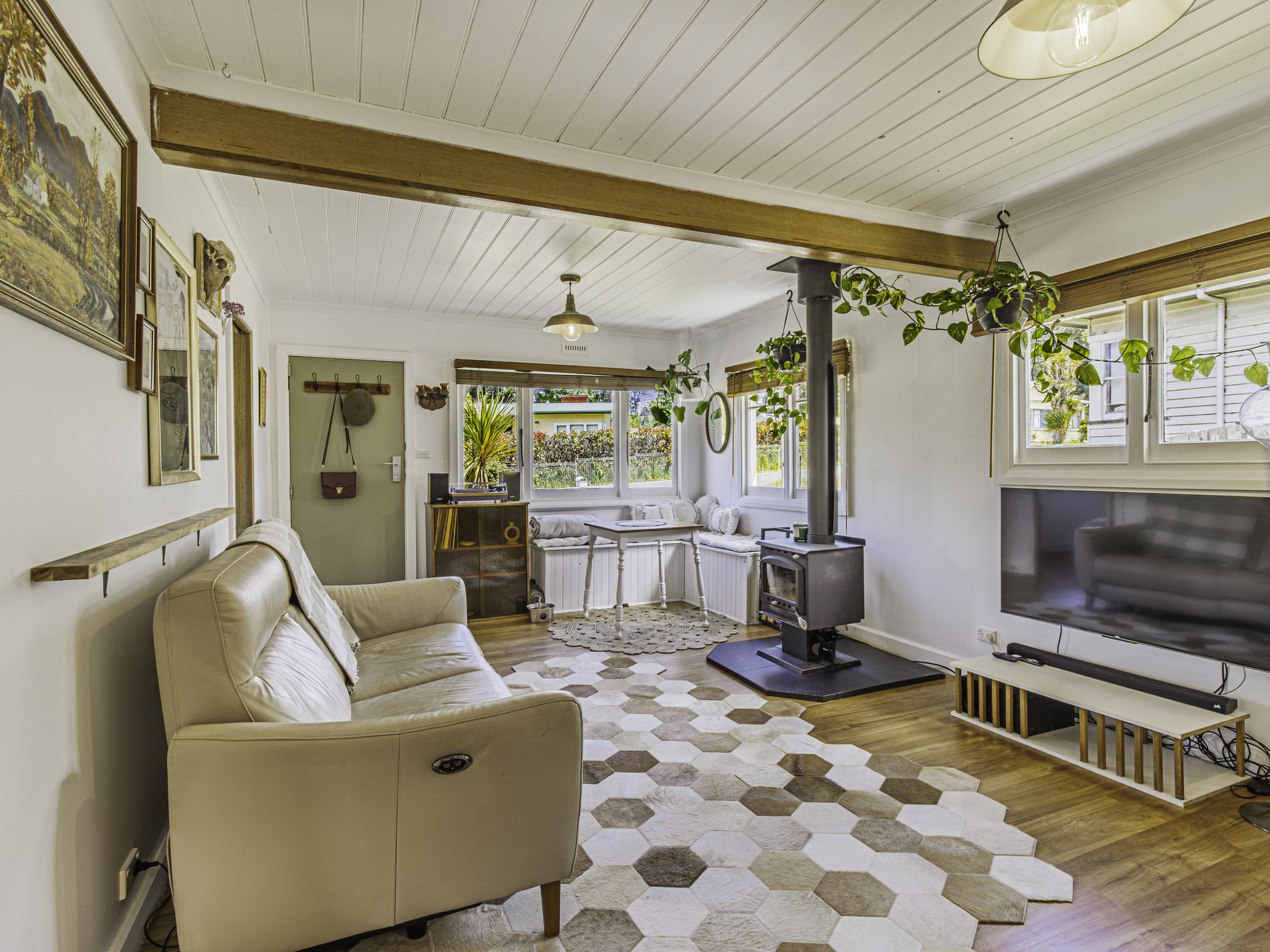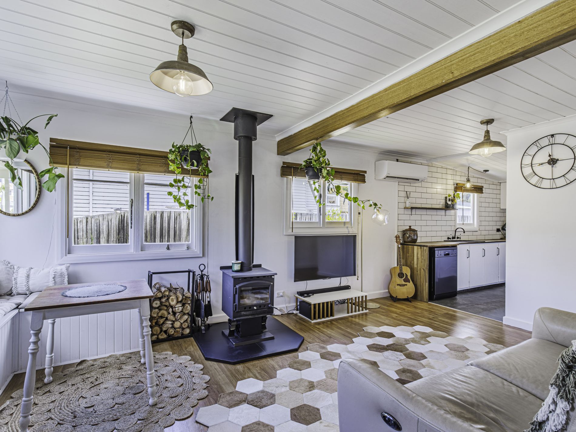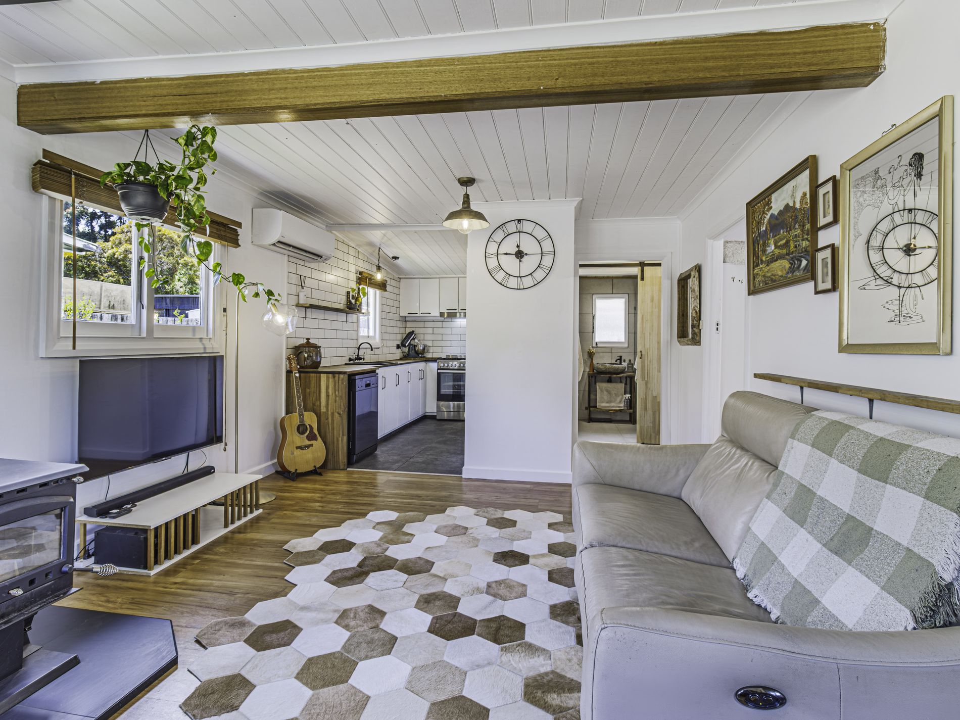 The delightful living area features a sunny window seat, space for dining, and year-round comfort thanks to both wood heating and a reverse-cycle heat pump. The bedrooms are generously proportioned, with the master now enhanced by built-in wardrobes.