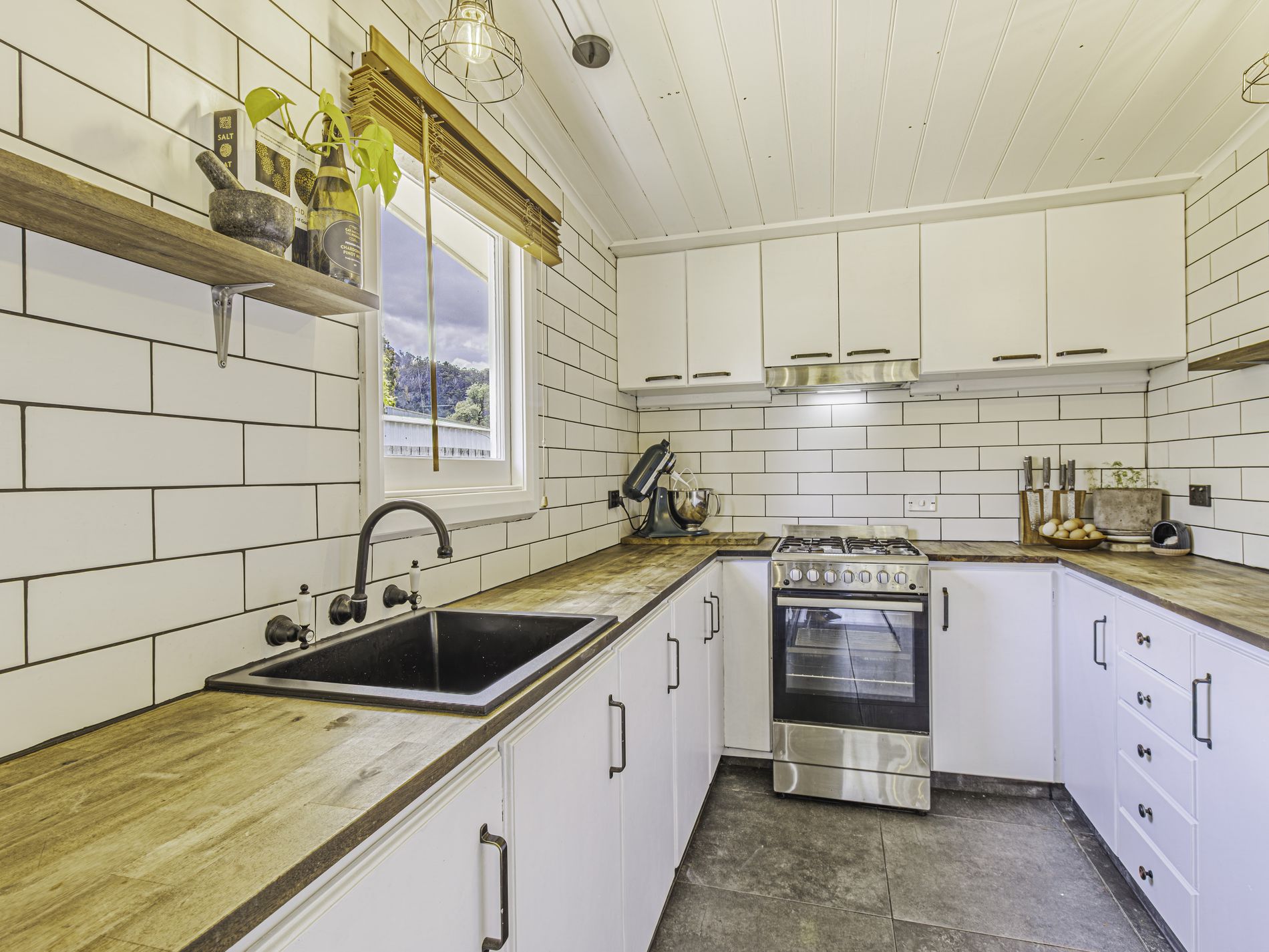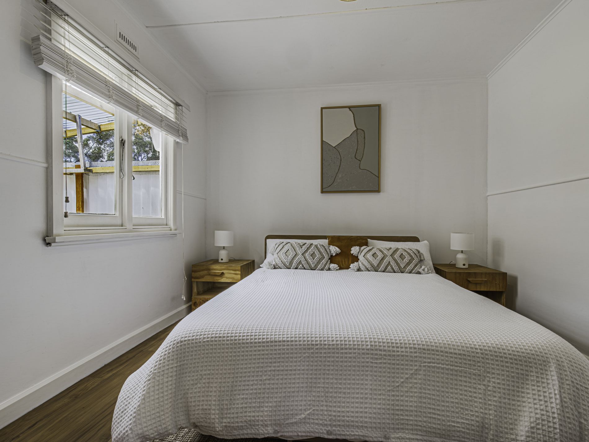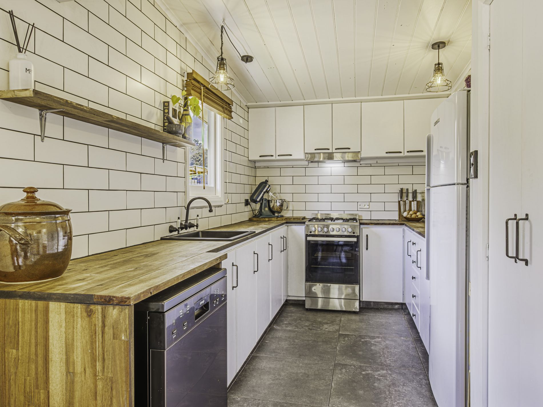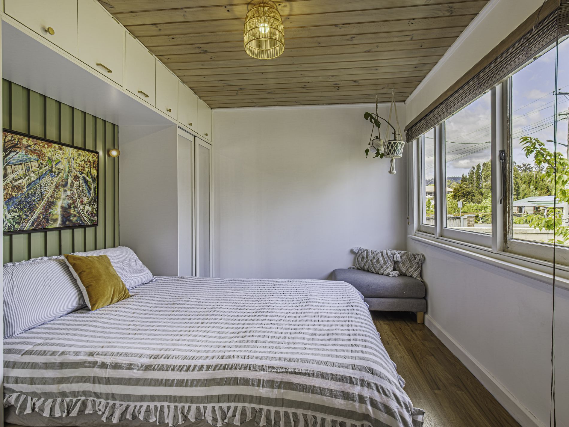 The delightful living area features a sunny window seat, space for dining, and year-round comfort thanks to both wood heating and a reverse-cycle heat pump. The bedrooms are generously proportioned, with the master now enhanced by built-in wardrobes.