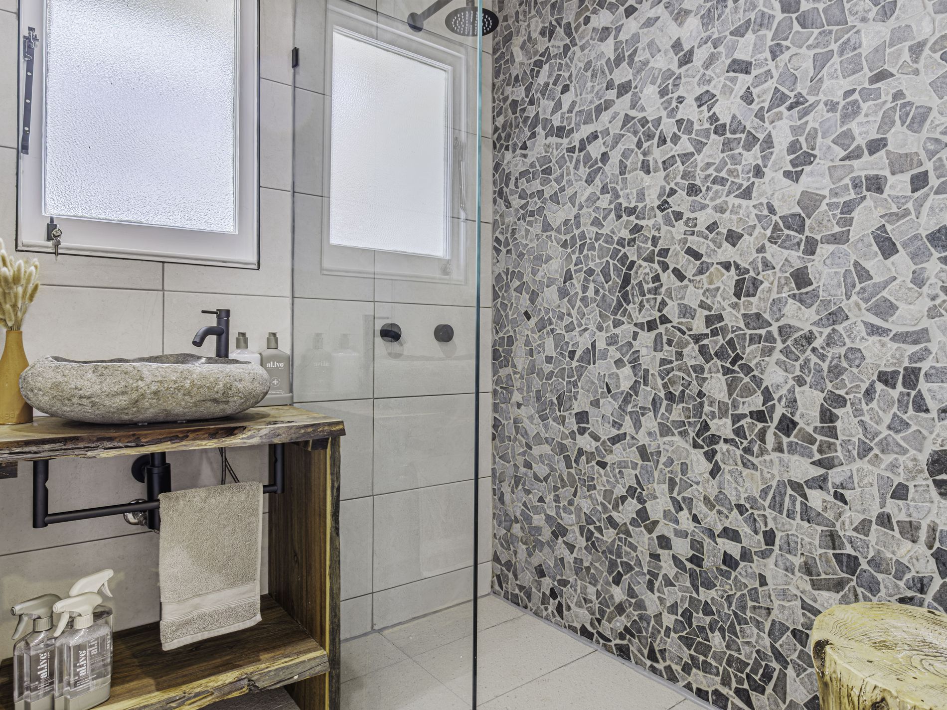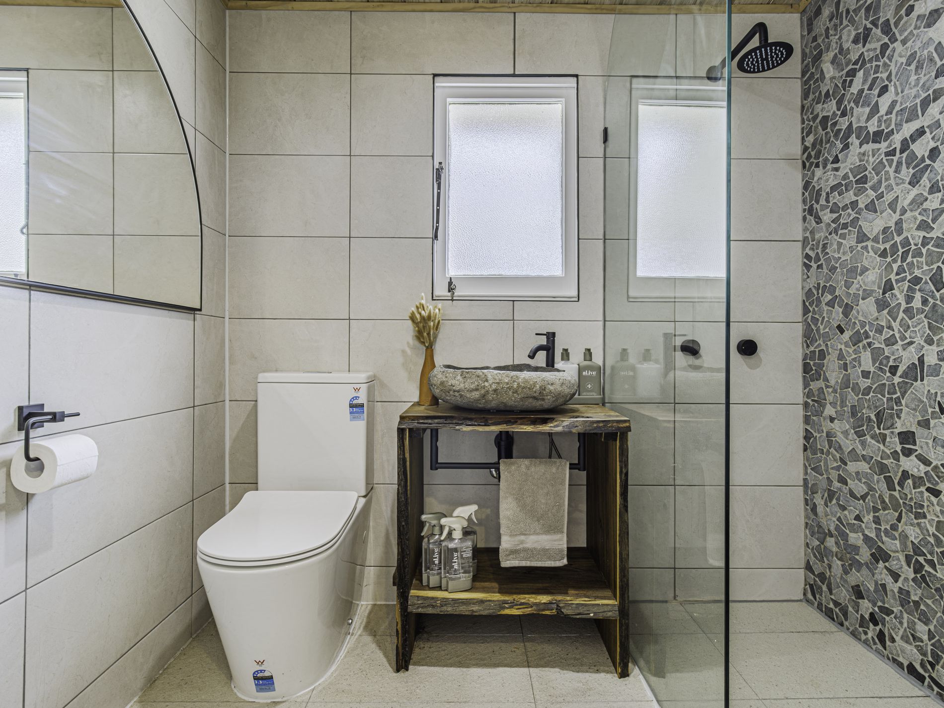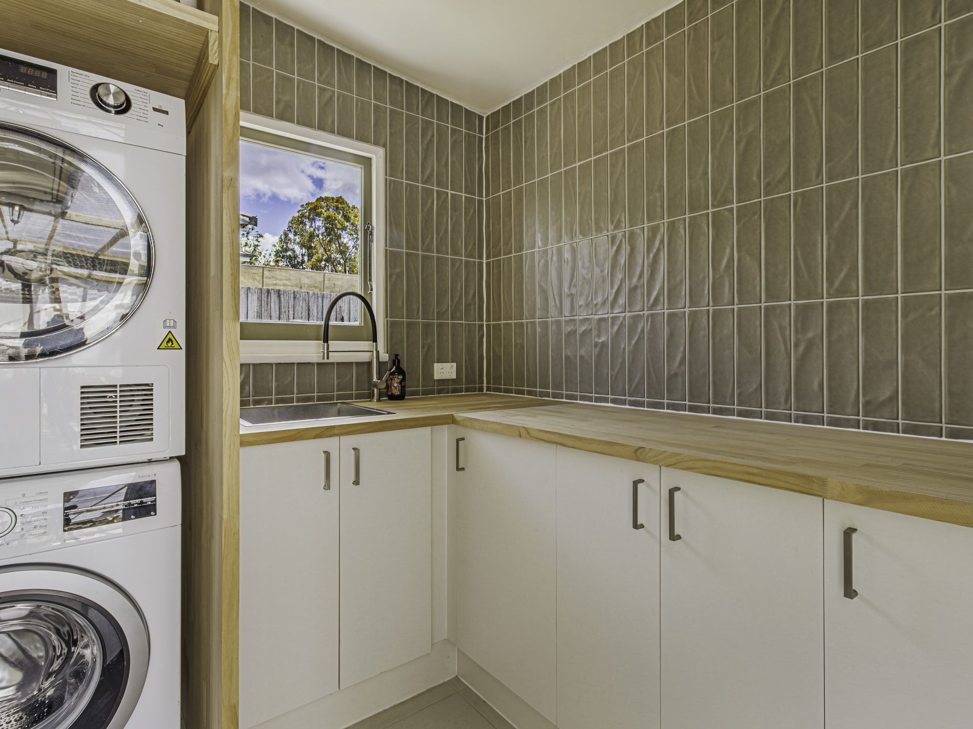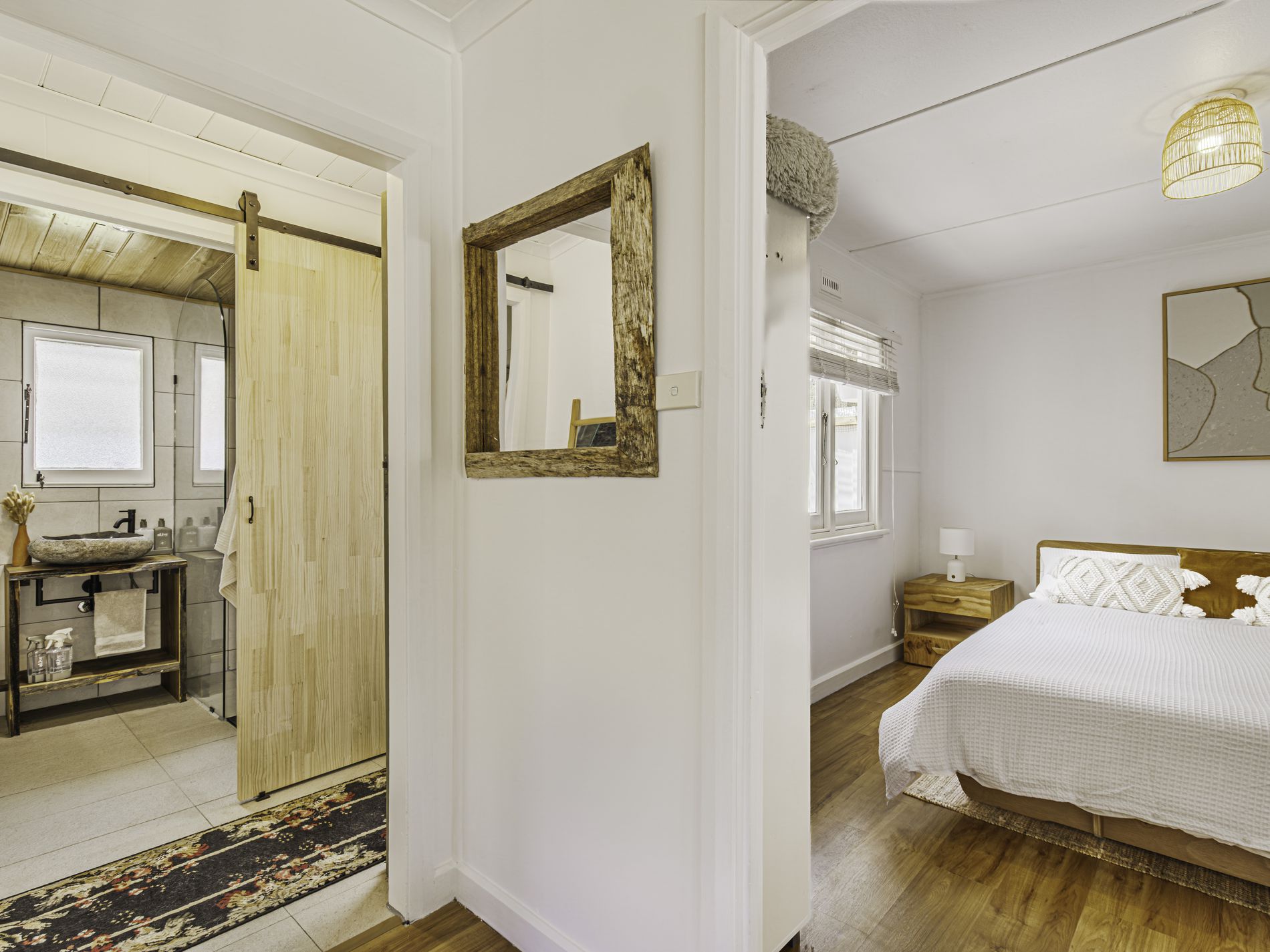 The bathroom is a standout, boasting a walk-in shower, vanity, and toilet, complemented by a pebble-style feature wall and a custom timber-accent vanity topped with a stone basin—an eye-catching statement piece. The laundry, located off the covered sundeck, has been fully renovated and offers excellent storage.