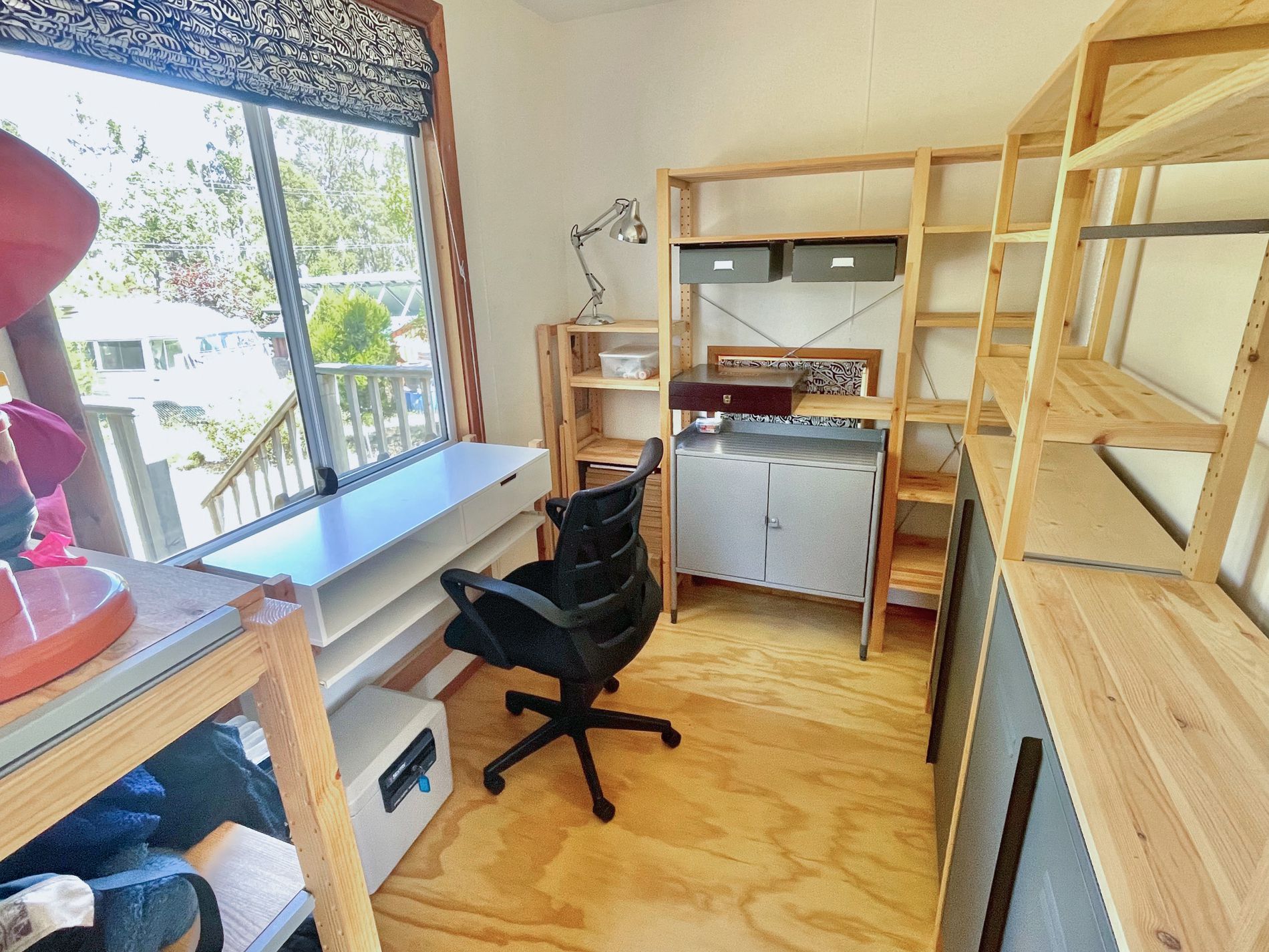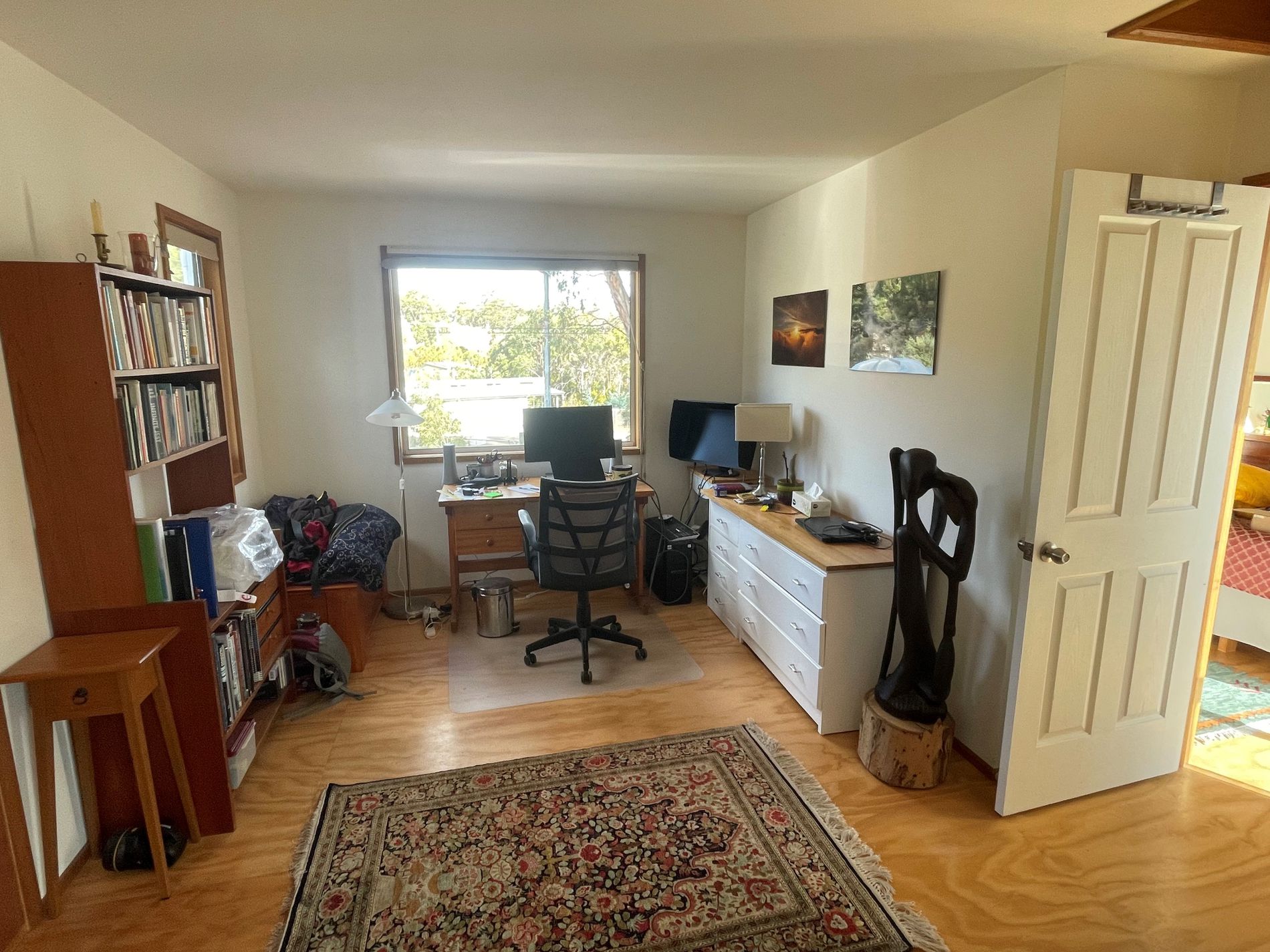 • Second bedroom: Currently set up as a study with storage; if unfurnished, it would comfortably fit a single bed