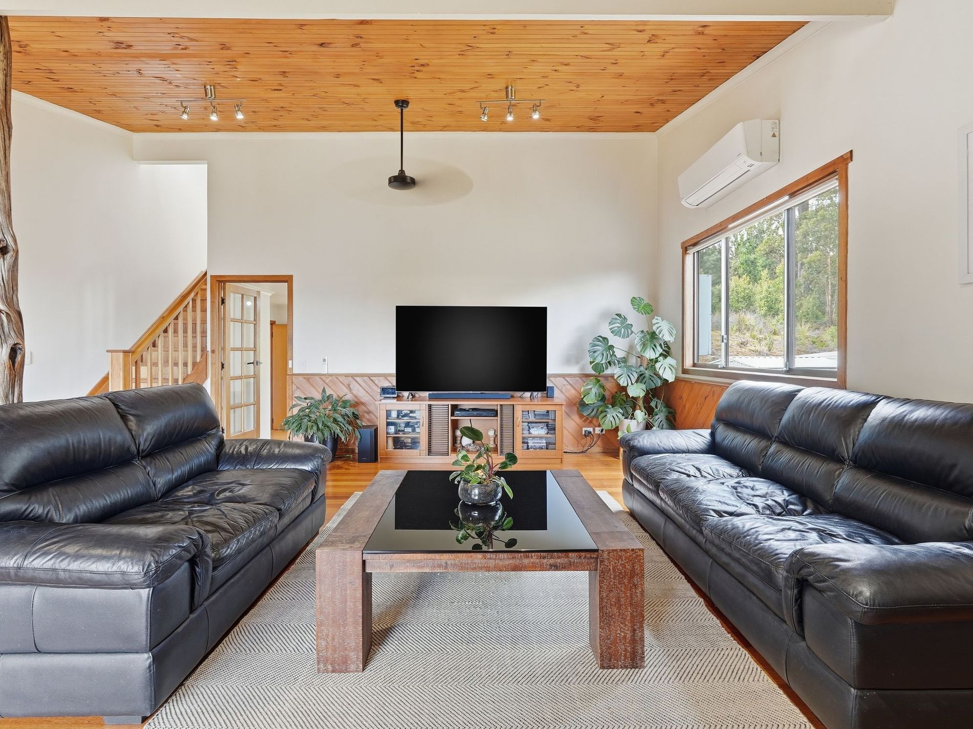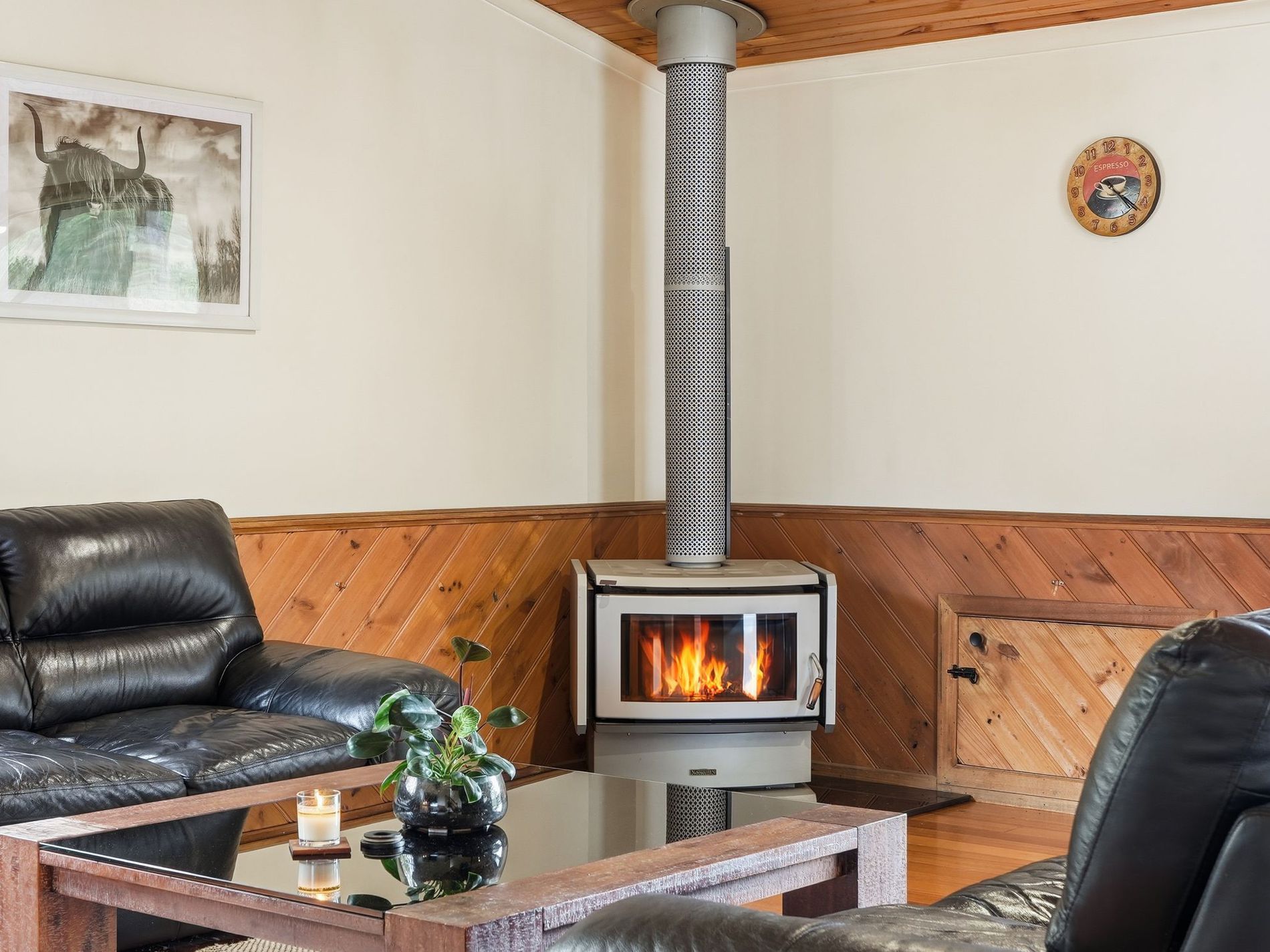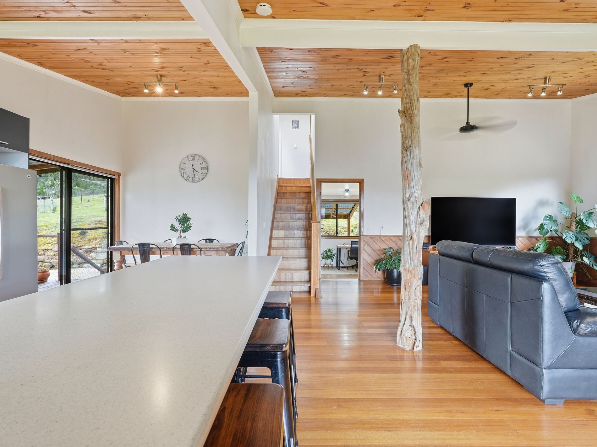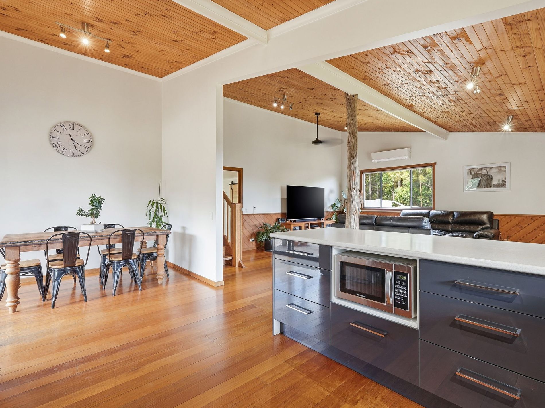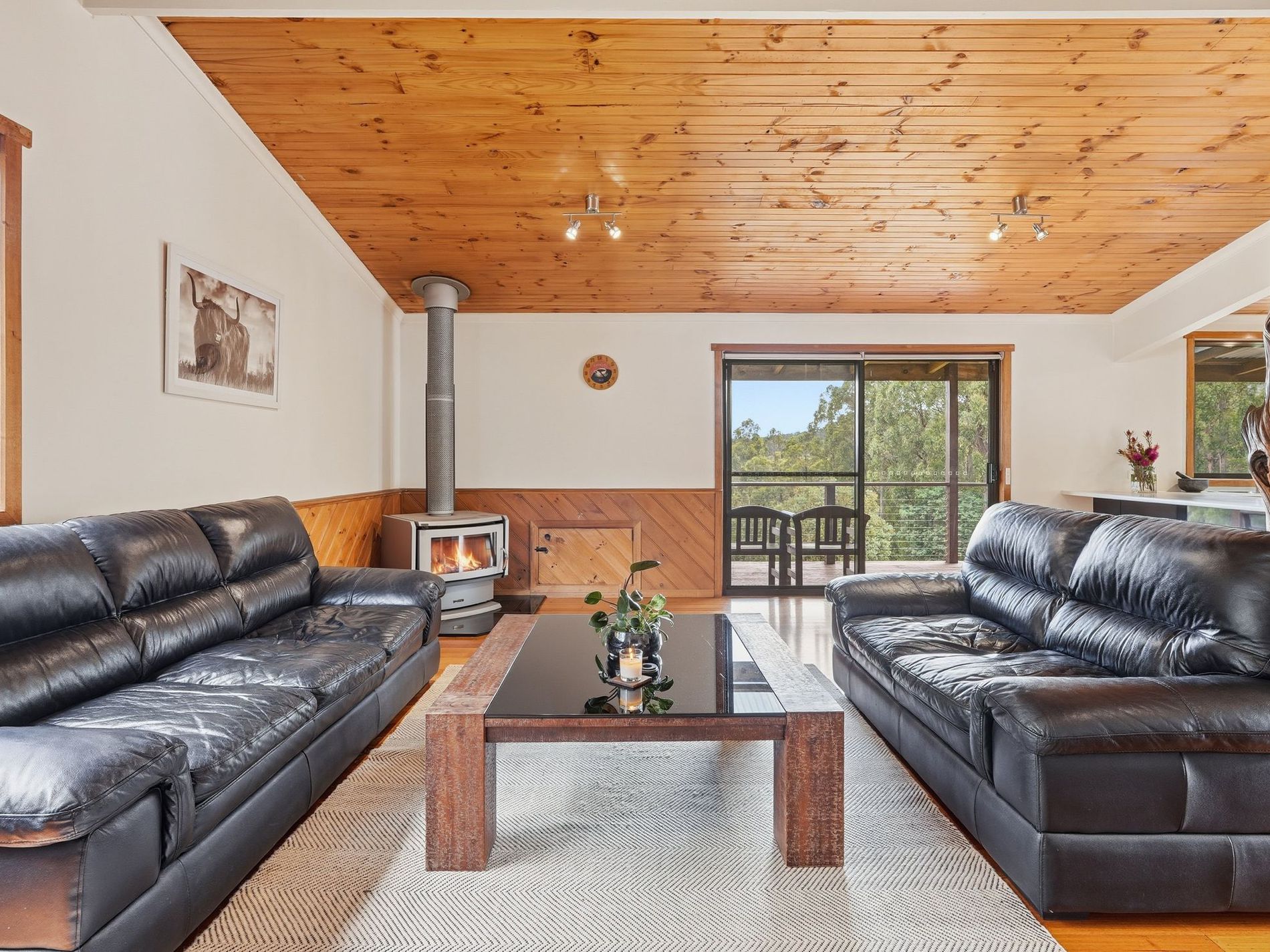 The living area is very generously proportioned and houses the Norseman wood heater that warms the home perfectly. The most impressive feature in this space is the raw-edge Huon pine beam that is showcased throughout — a gorgeous natural artwork that perfectly grounds the space.