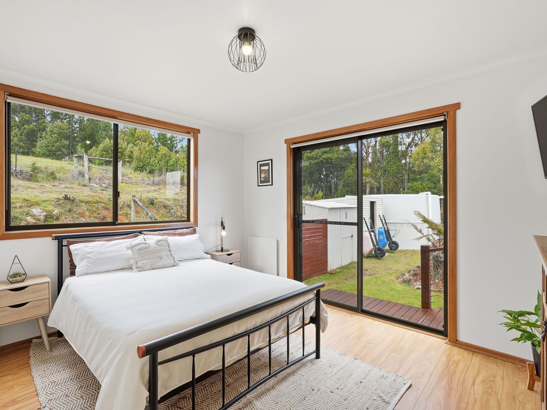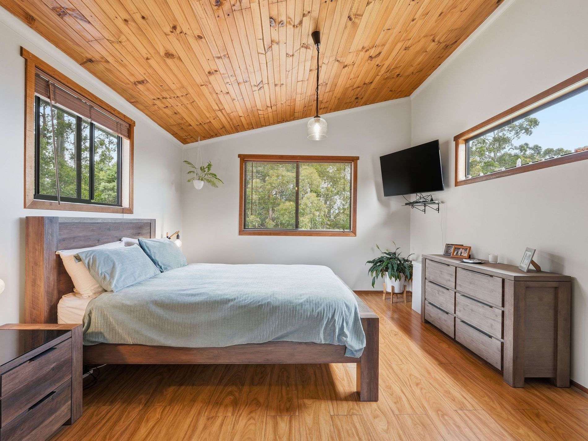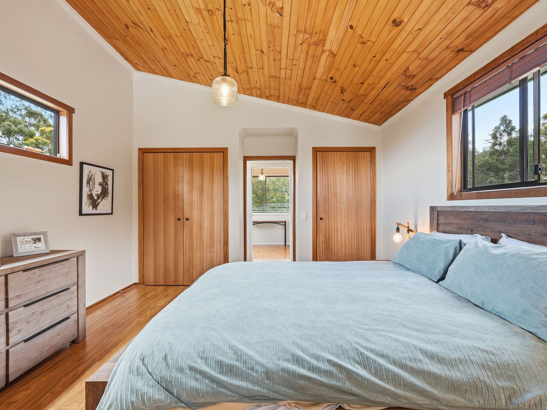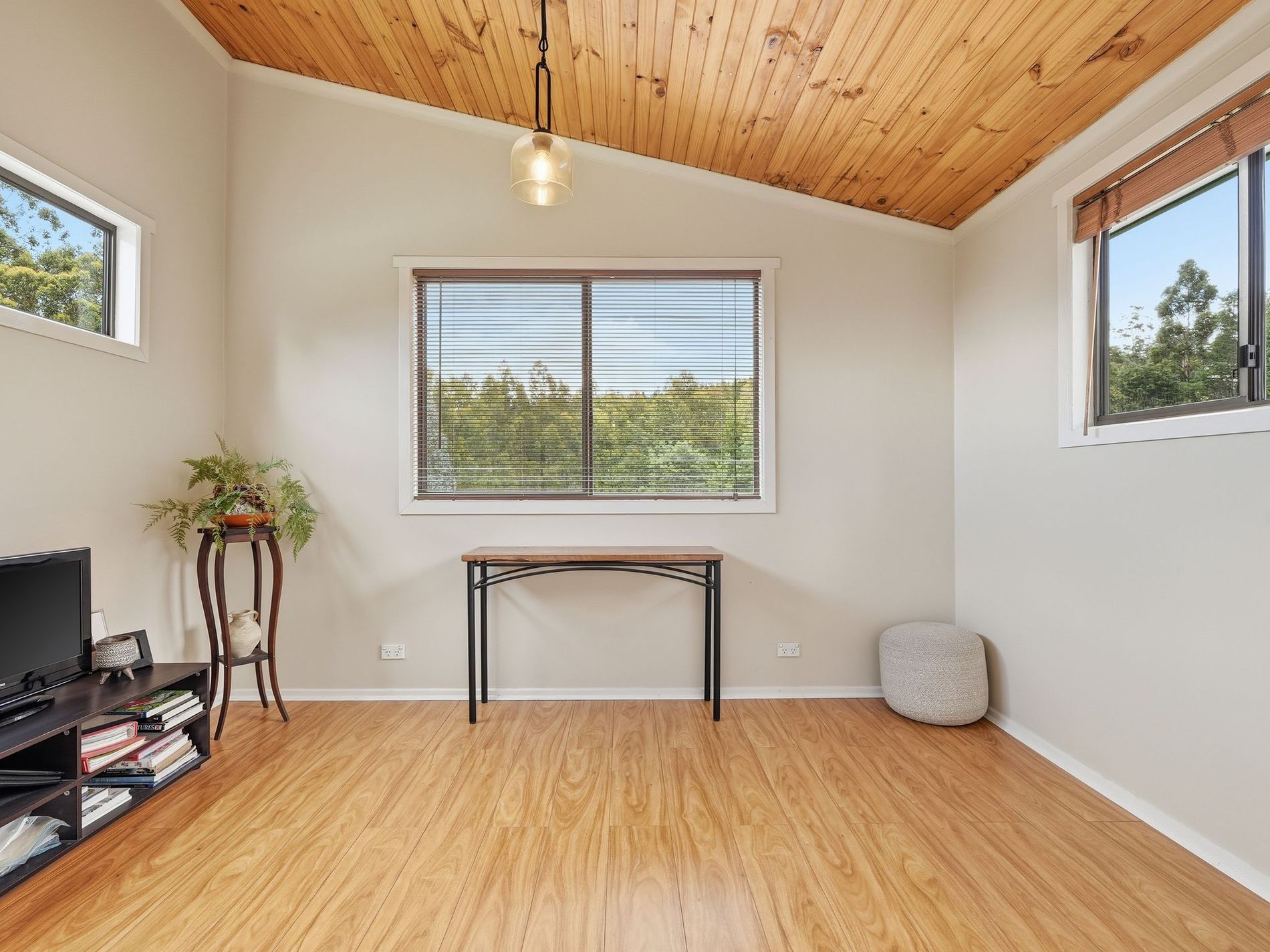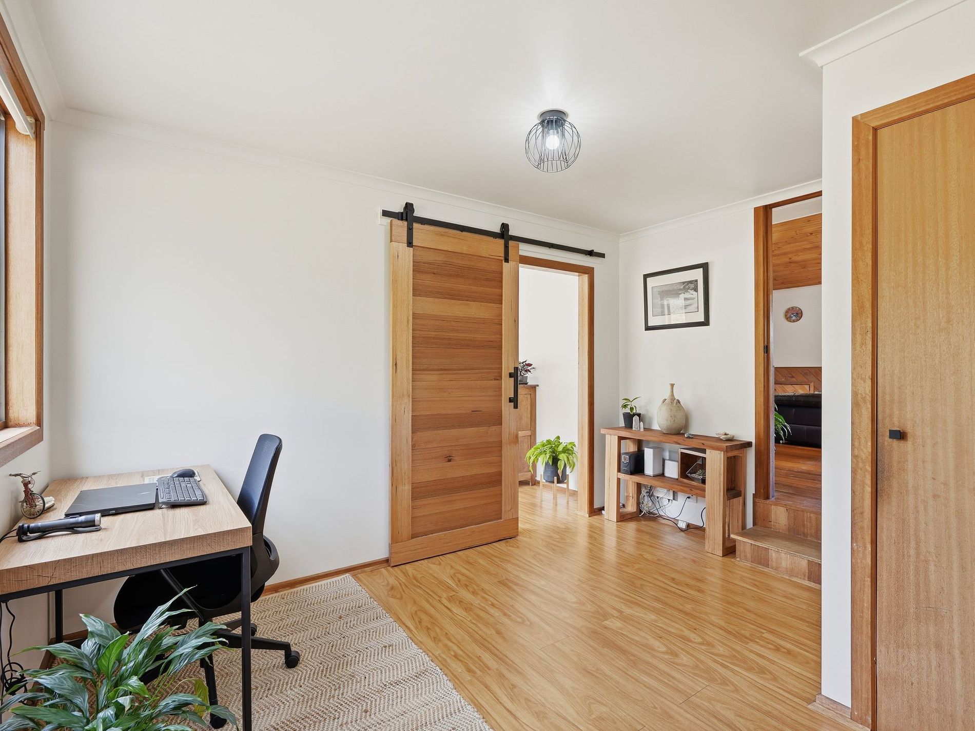 The living area is very generously proportioned and houses the Norseman wood heater that warms the home perfectly. The most impressive feature in this space is the raw-edge Huon pine beam that is showcased throughout — a gorgeous natural artwork that perfectly grounds the space.