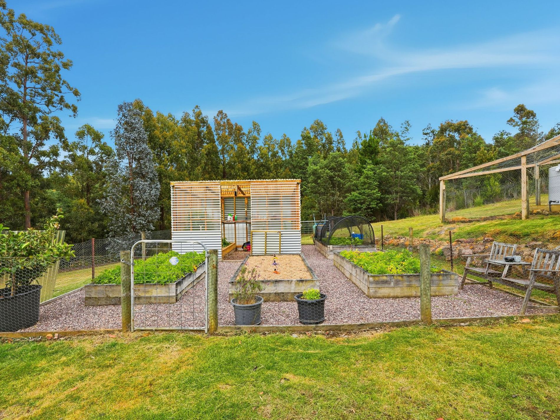 Outside, you’re sure to be impressed with the thoughtful, well-considered landscaping, as well as the quality infrastructure. A convenient carport sits at the rear of the house, allowing for direct access inside. There is a palace for the chickens, handmade from celery top pine, a well-fenced veggie area with a hot house, and an under-house workshop with its own wood-heater. Also located on the acreage is an old shed that could be restored to provide lockable storage.