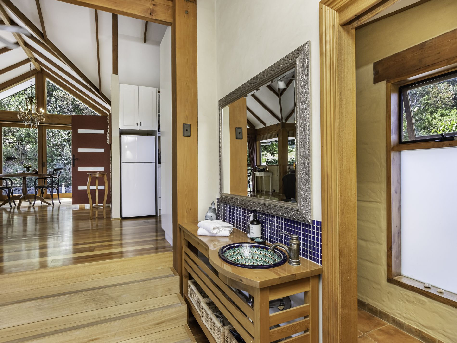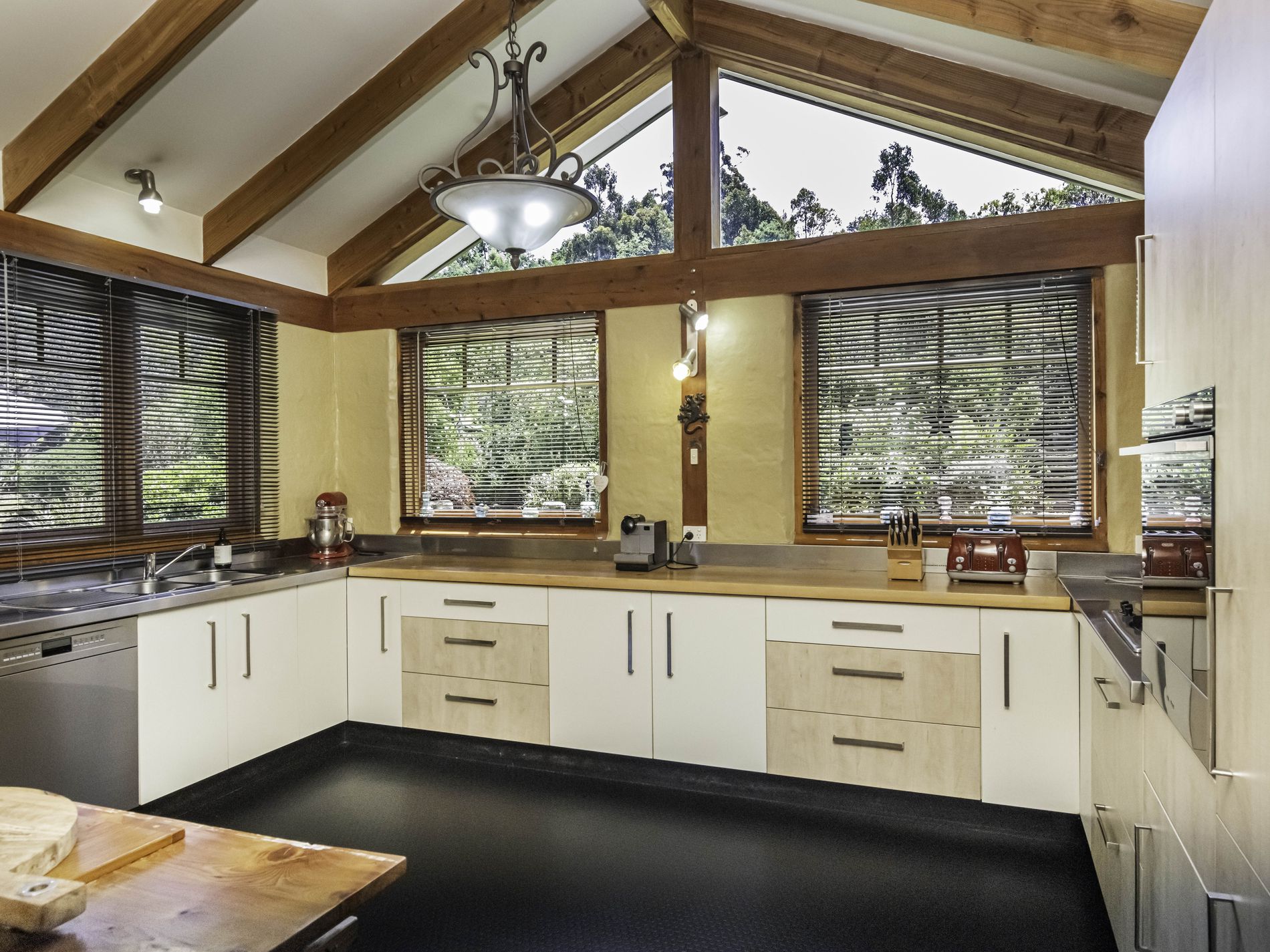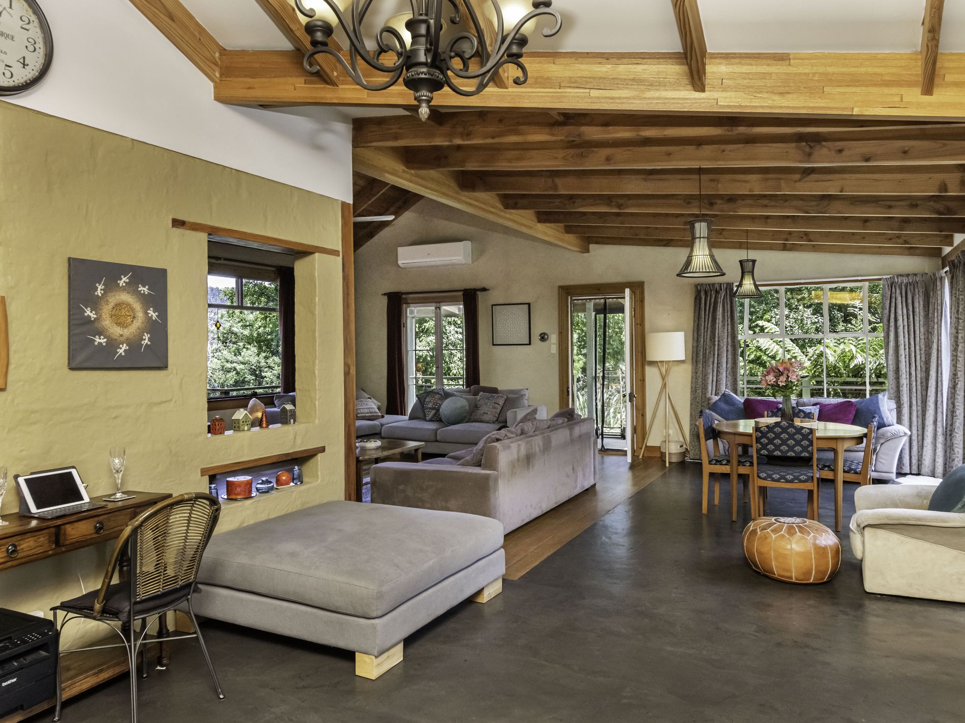 The main residence is filled with natural light and showcases a spacious open-plan living area brimming with character. Exposed timber beams, high ceilings, a cosy wood-fire nook and expansive windows draw the outdoors in, creating a welcoming and relaxed atmosphere. The kitchen is a standout, offering abundant bench space, generous storage, modern appliances and excellent natural light—an entertainer’s and chef’s dream.
