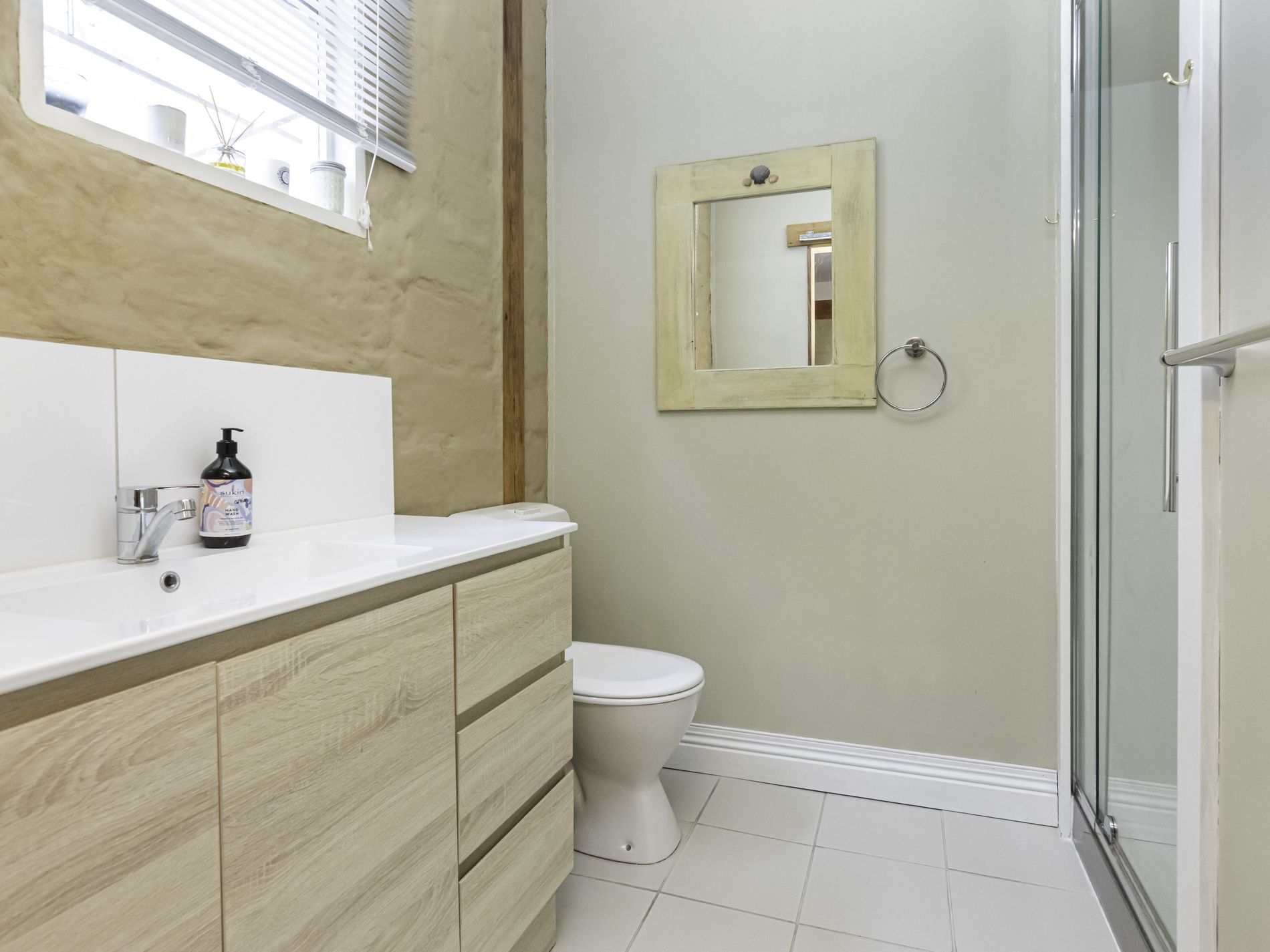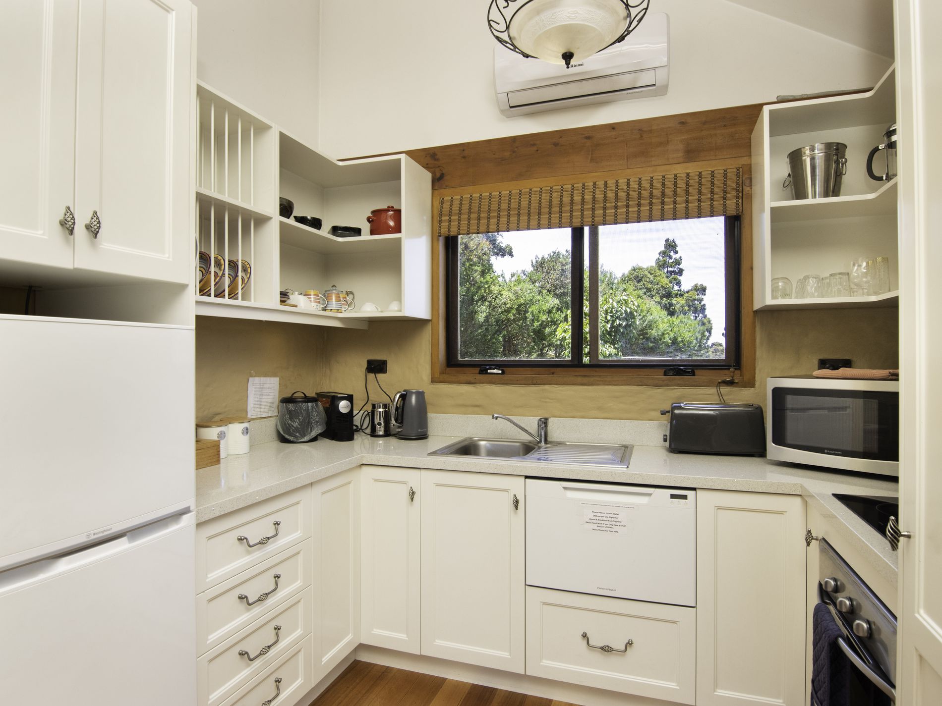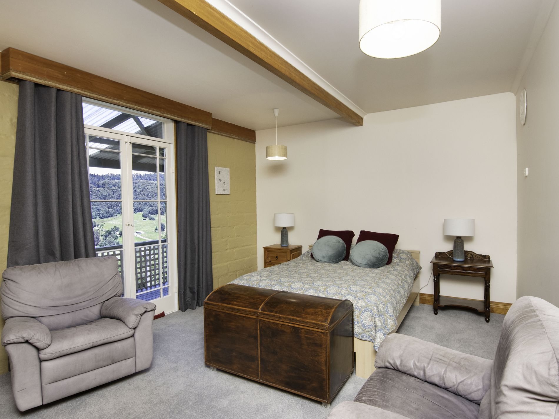 The main residence is filled with natural light and showcases a spacious open-plan living area brimming with character. Exposed timber beams, high ceilings, a cosy wood-fire nook and expansive windows draw the outdoors in, creating a welcoming and relaxed atmosphere. The kitchen is a standout, offering abundant bench space, generous storage, modern appliances and excellent natural light—an entertainer’s and chef’s dream.
