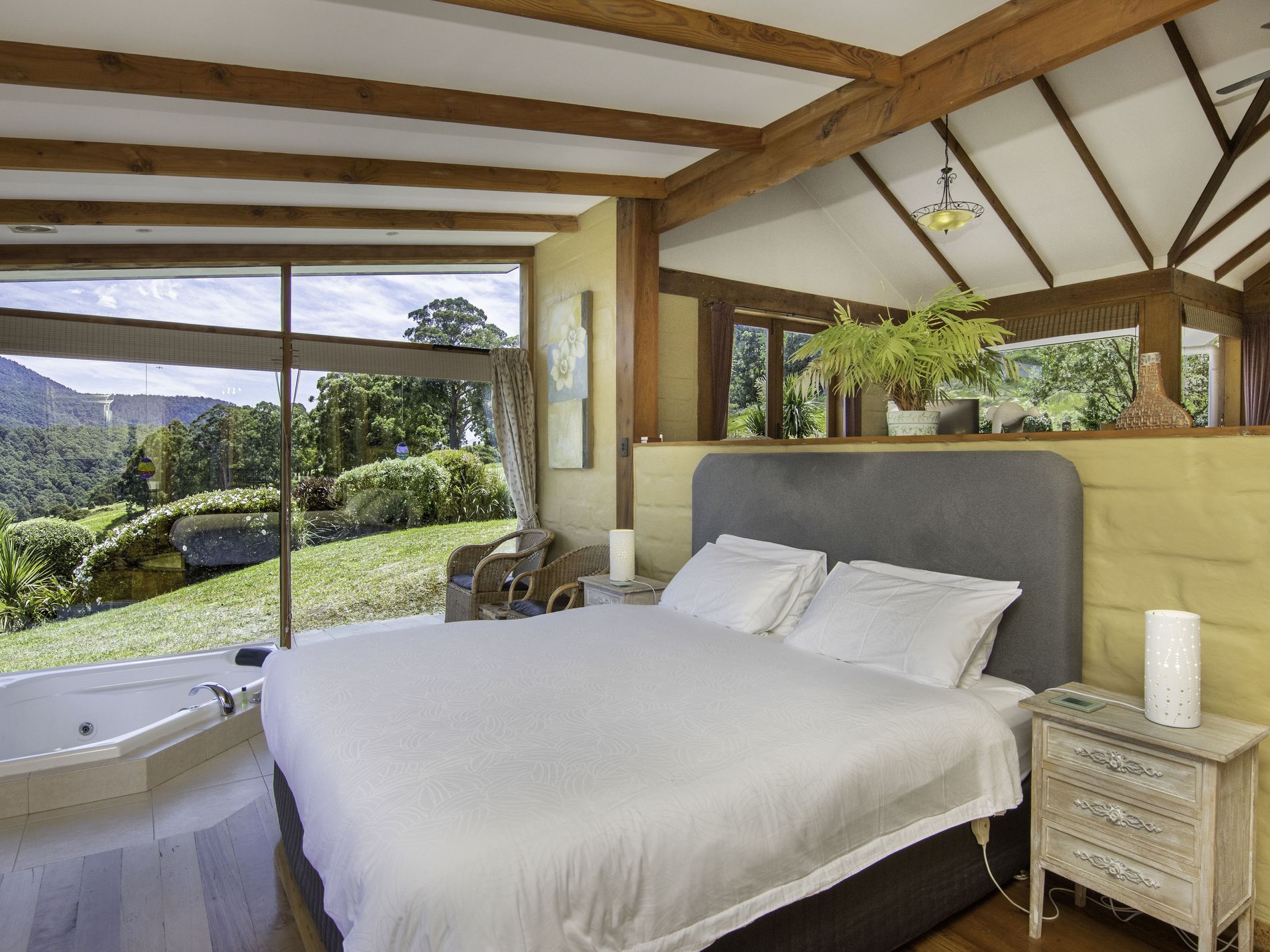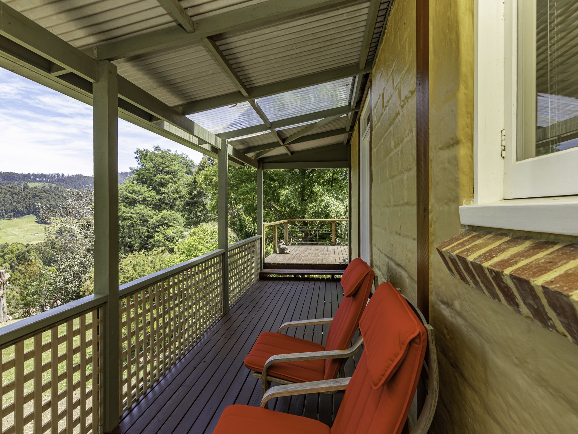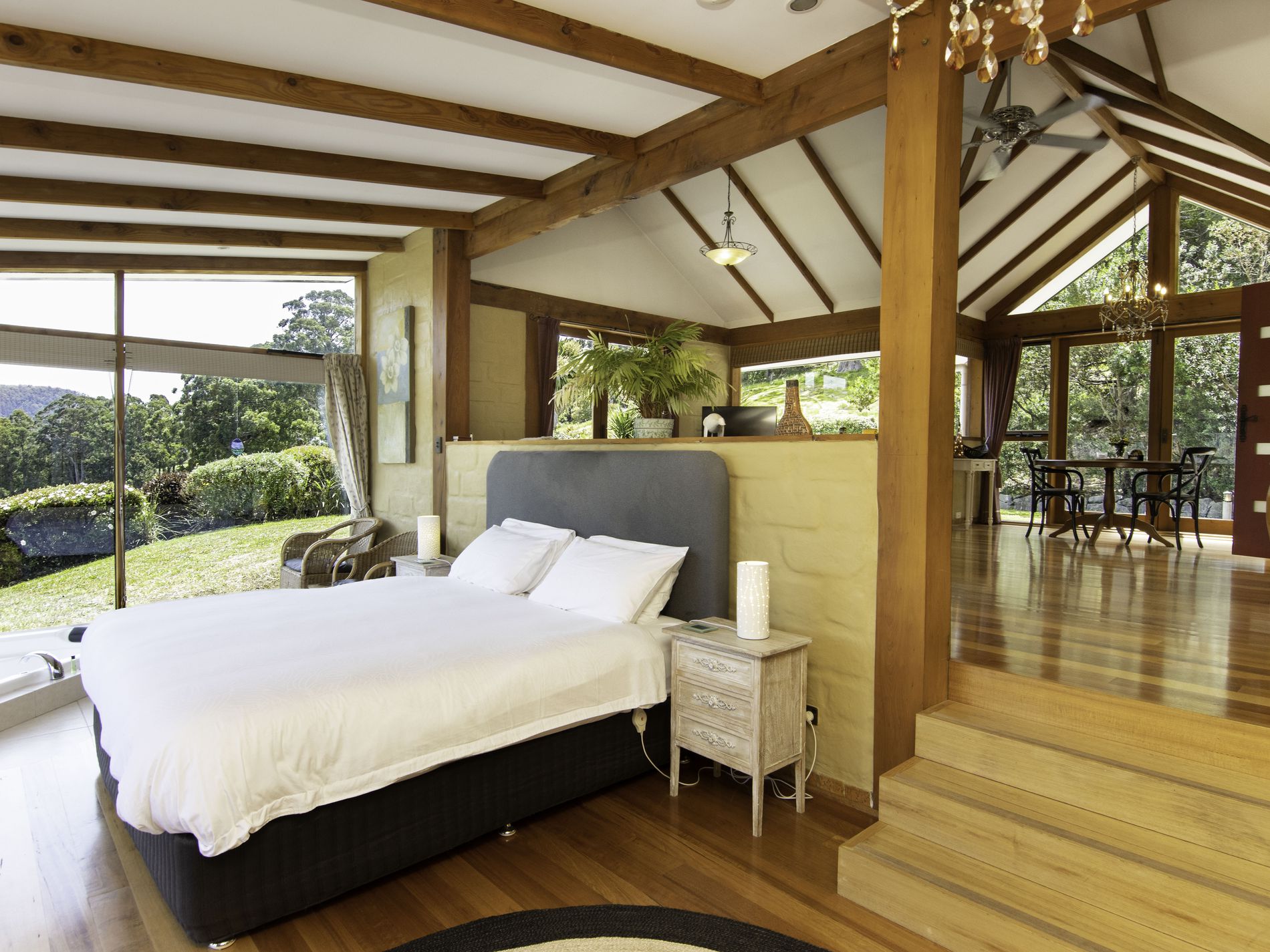 The separate accommodation mirrors the charm of the main residence, also constructed from mud brick and full of character. Designed over split levels, the entry level comprises a welcoming living and dining area with a functional kitchen. The bedroom is positioned below and features a luxurious spa bath overlooking the valley—an idyllic retreat at the end of the day—along with a separate bathroom for convenience. French doors open to a covered sundeck, creating an inviting space for breakfast or quiet reflection, surrounded by meticulously maintained gardens that offer guests complete privacy and tranquillity.