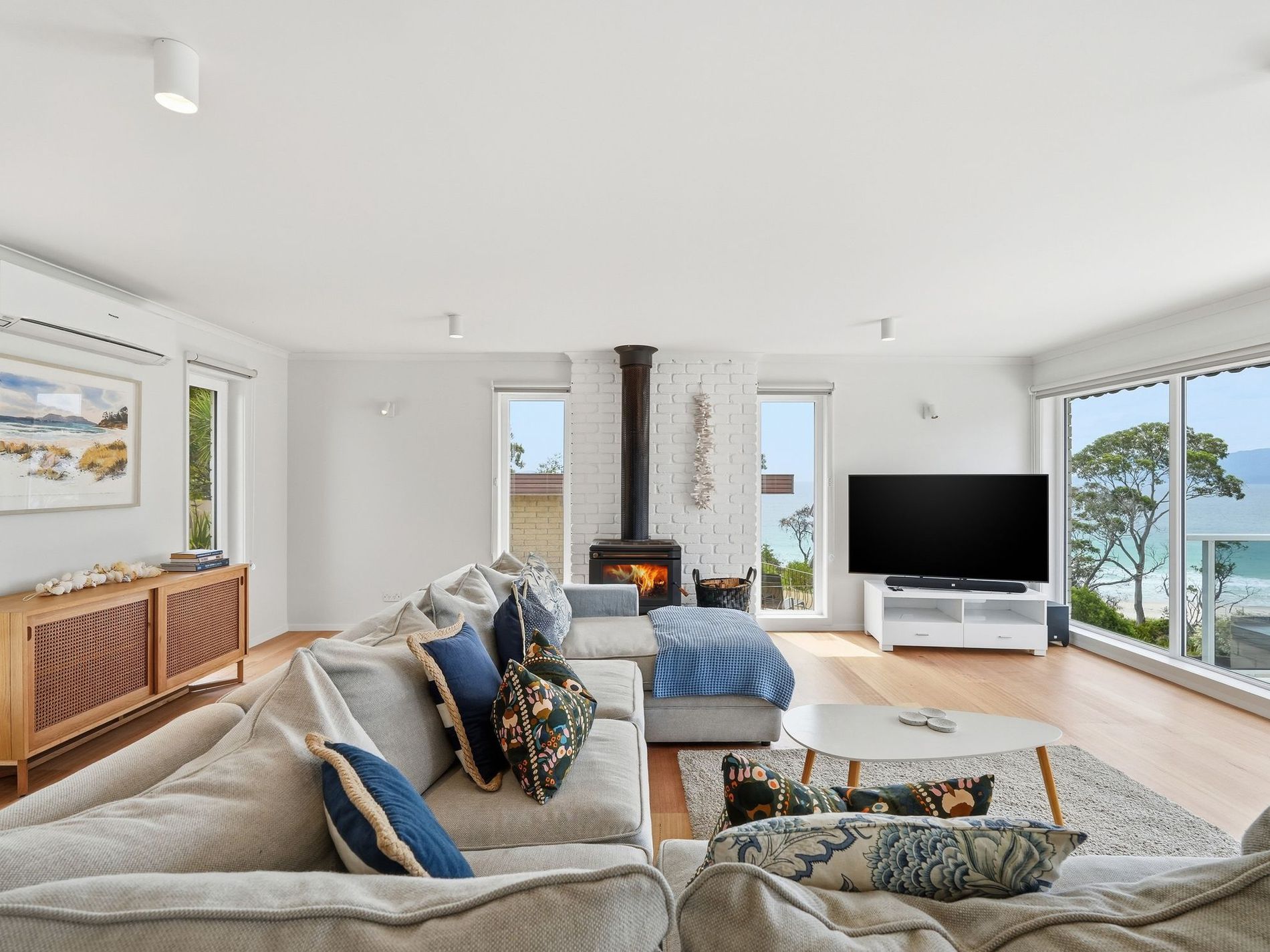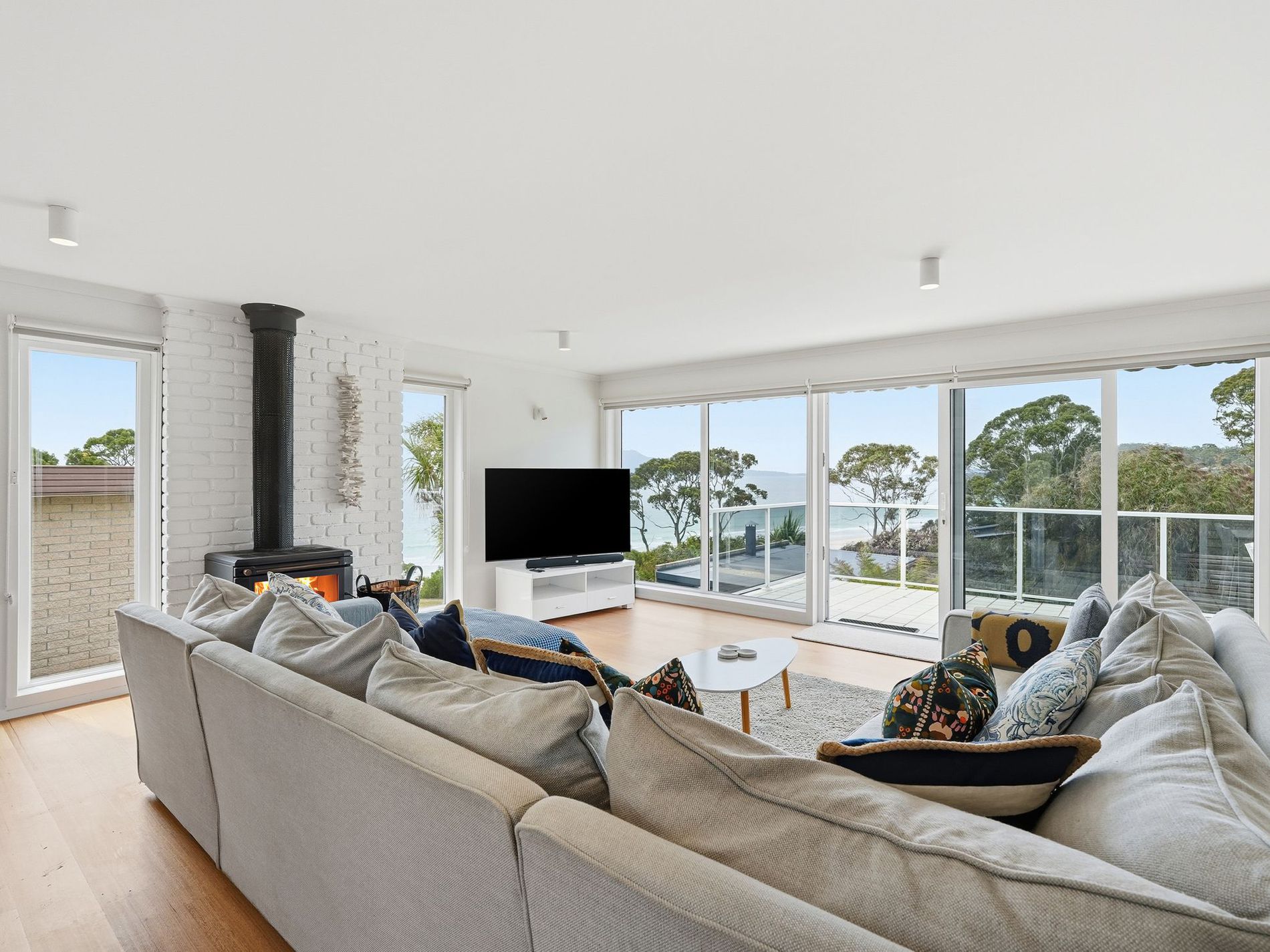 Upstairs is dedicated to everyday living, with generous proportions and seamless connection to a glass-balustraded deck that captures both sunshine and sweeping coastal views — an ideal spot for morning coffees, long lunches or watching the sun set across the water. Comfort has been carefully considered year-round, with double-glazed windows, the convenience of a heat pump, and the warmth and atmosphere of a wood heater for cooler months.