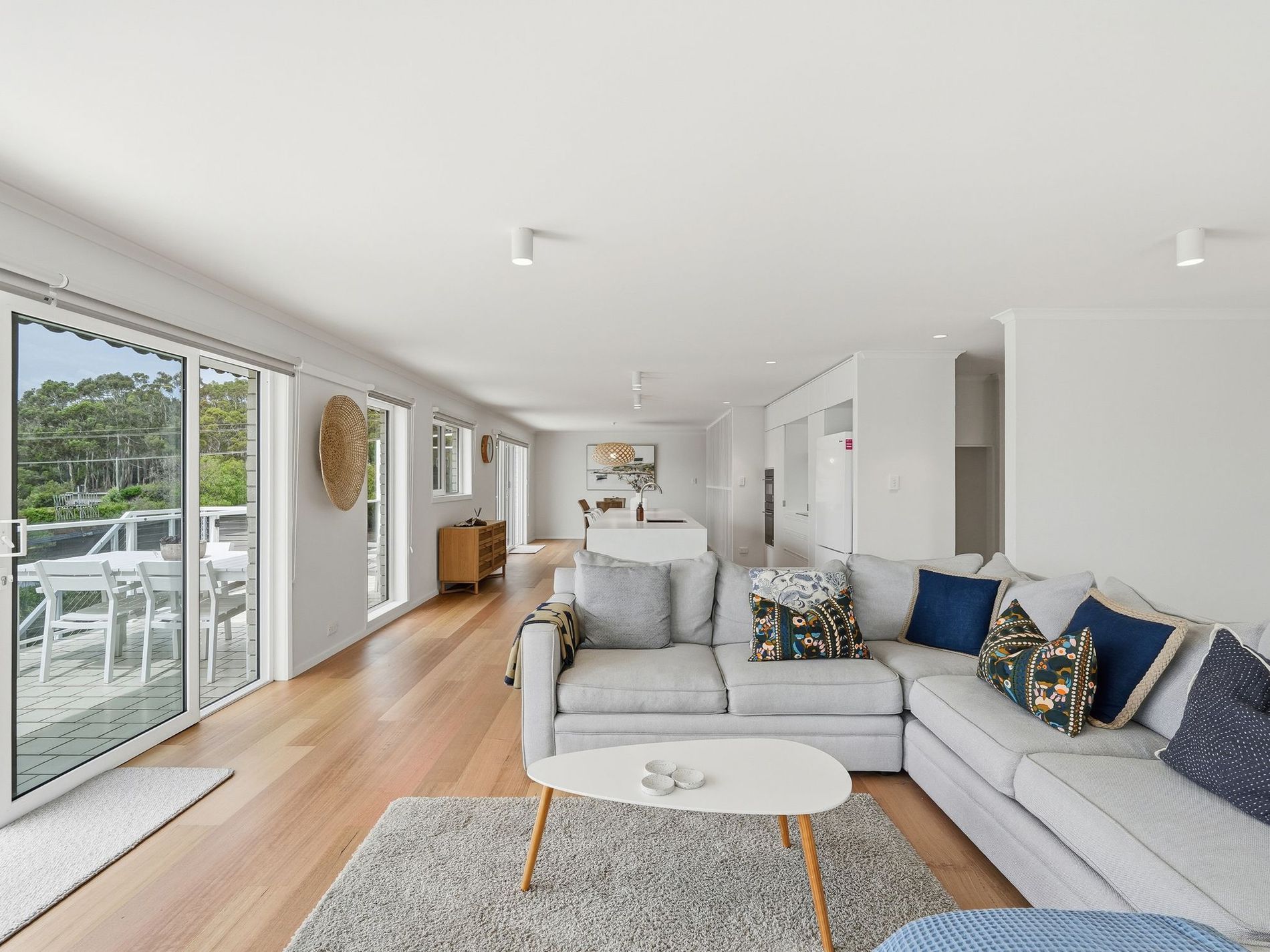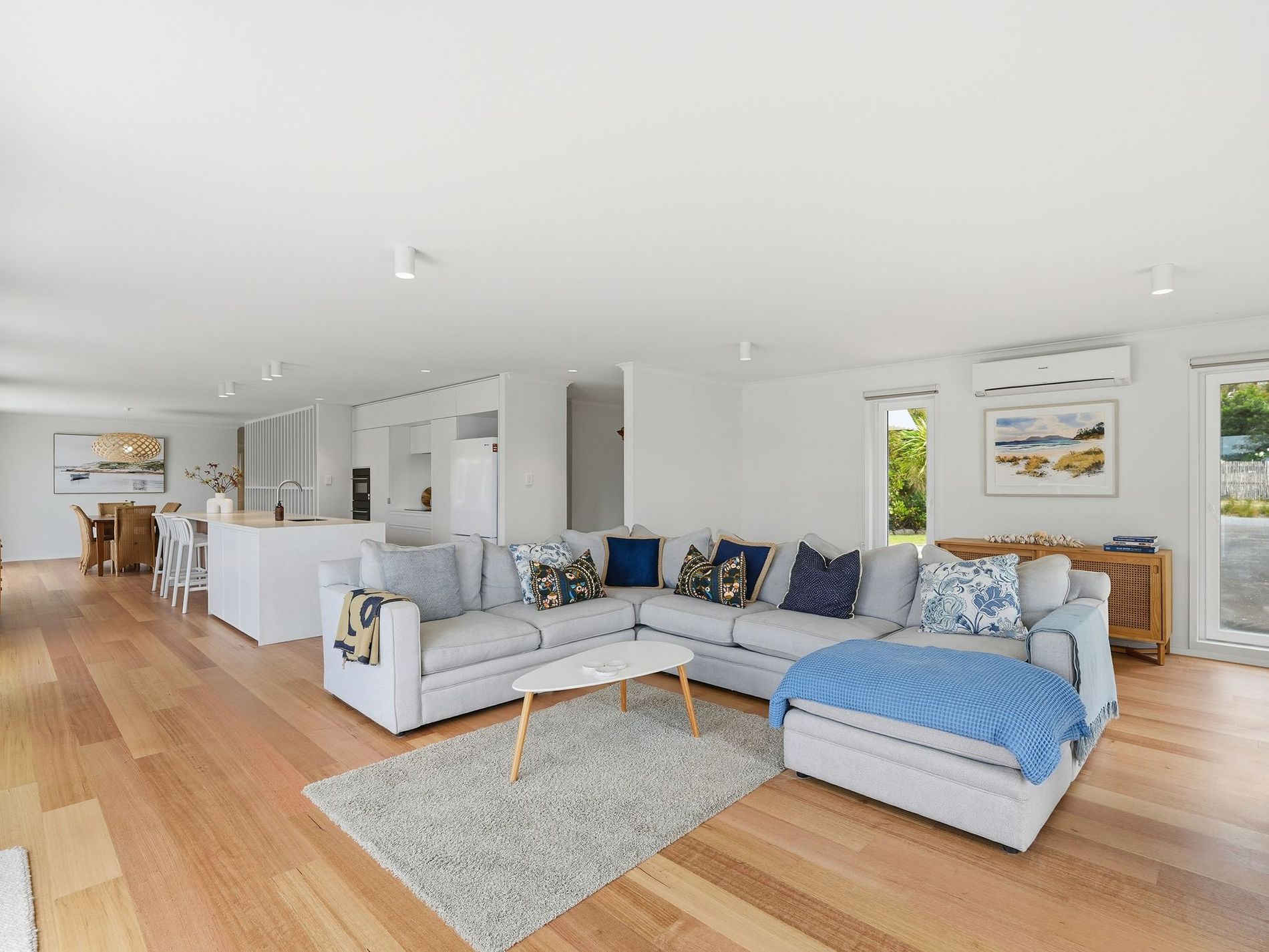The open-plan living, kitchen and dining zone is light-filled and perfectly connected, designed for relaxed beachside living and easy entertaining. Clean lines, modern finishes and a calm coastal palette create a space that feels both refined and inviting, a home that immediately puts you at ease. Stunning Tas Oak floors add a classic warmth and the feature lighting bounces light at every angle.