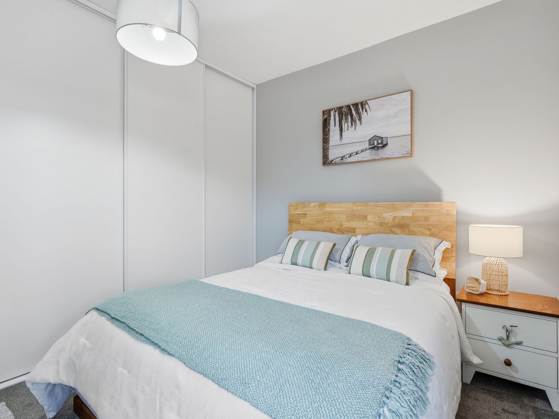 - Carpeted hallway connecting three well-sized bedrooms, each with double blinds and full-height built-in wardrobes
