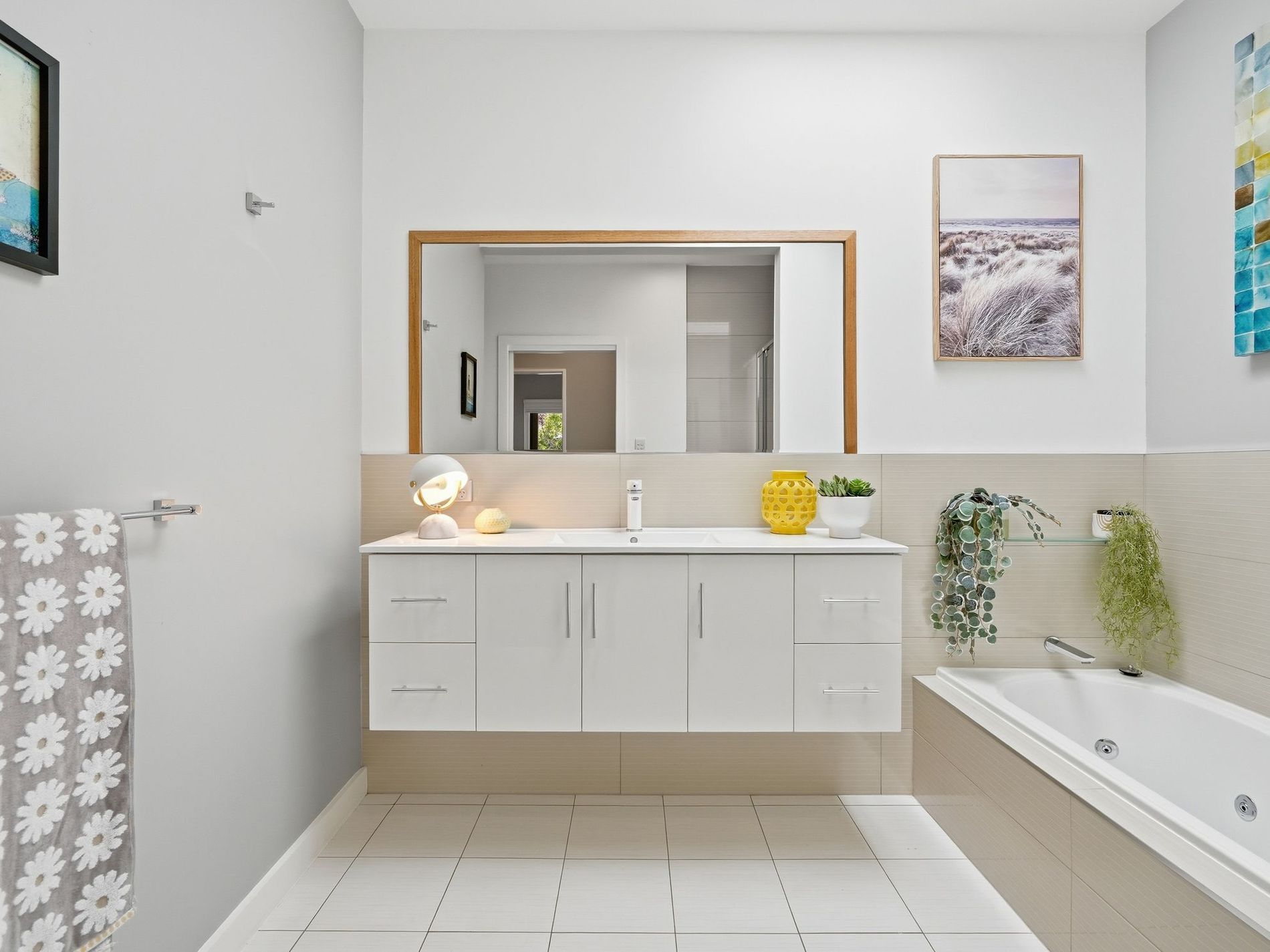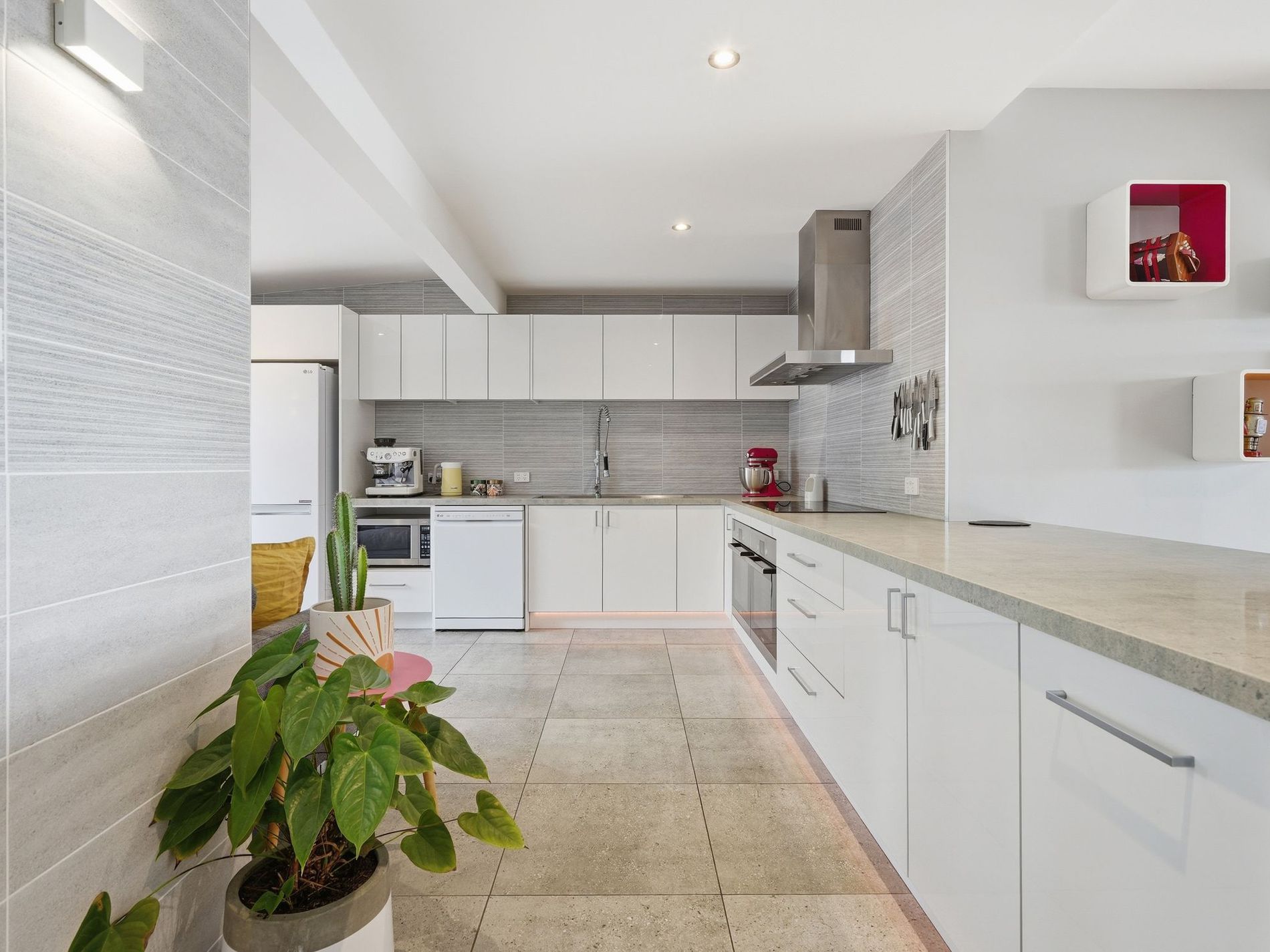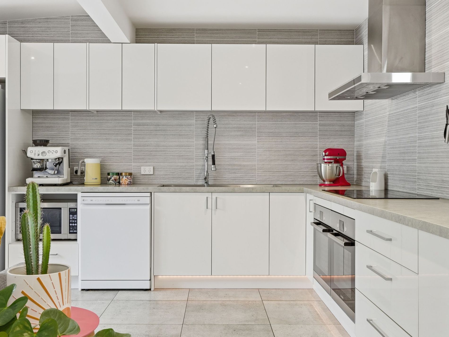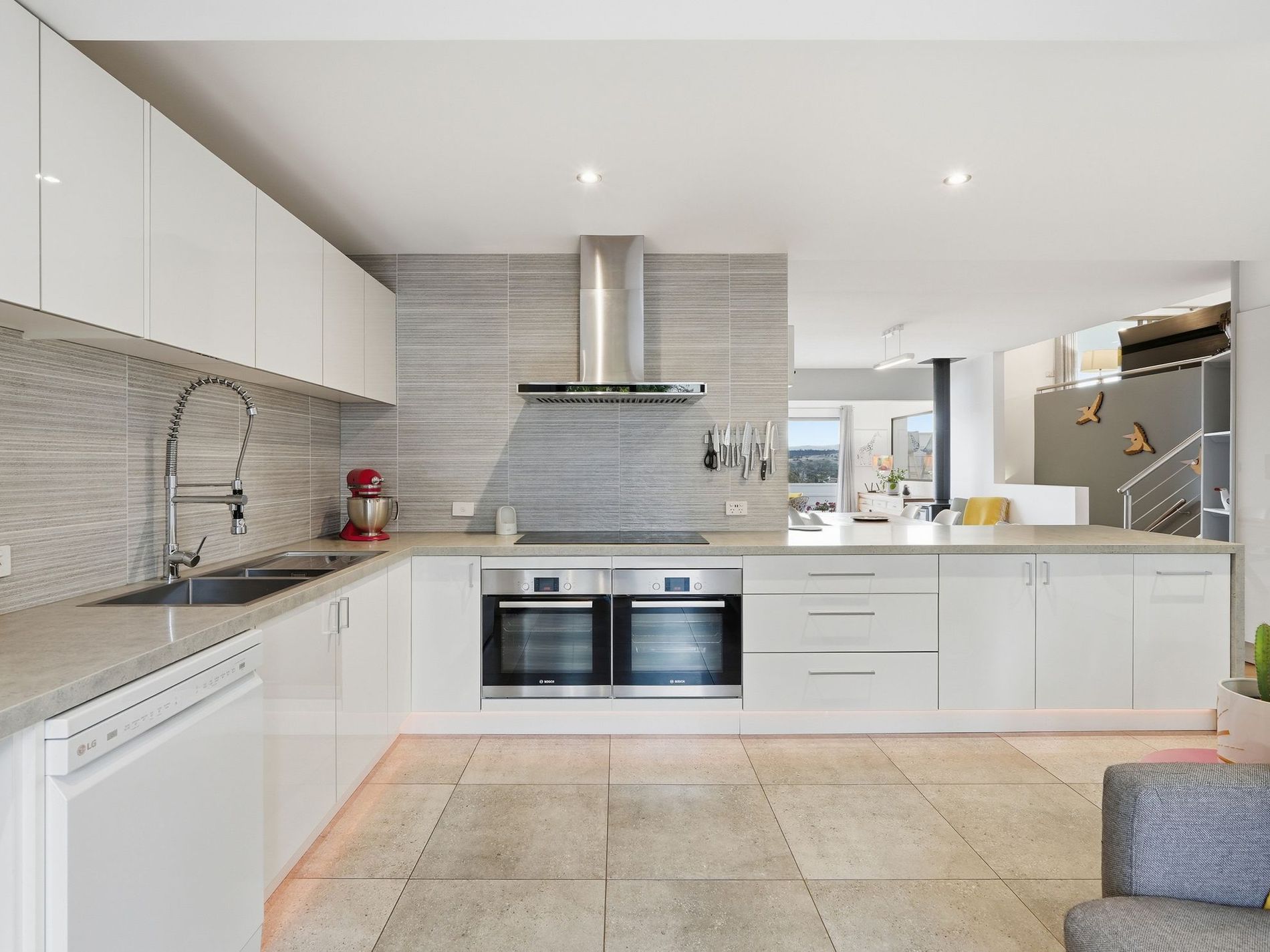 - A beautifully appointed kitchen with Caesarstone benchtops, double oven, soft-close cabinetry, breakfast bar, subtle LED lighting, and tiled flooring