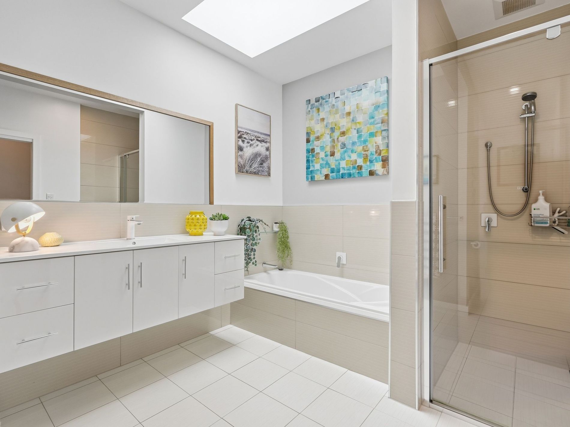 - Main bathroom featuring a skylight, elevated ceilings, and a luxurious spa bath.