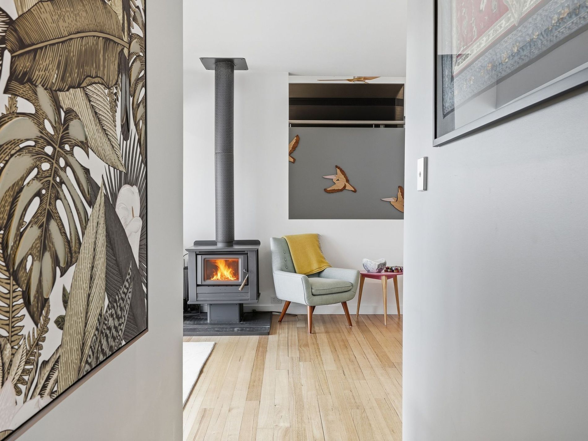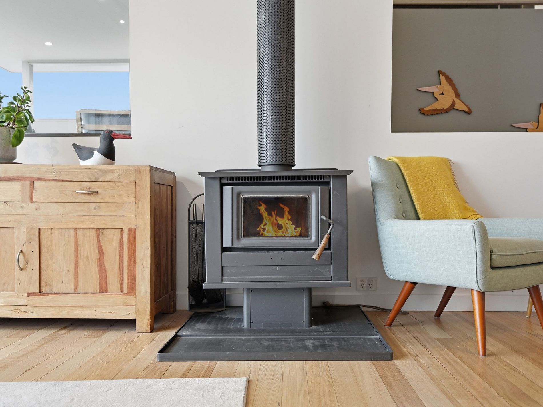 - Light-filled dining space with warm timber floors, feature lighting, heat pump, wood heater, and in-built shelving