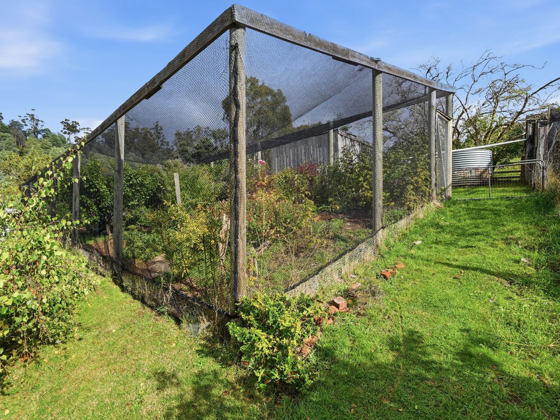 The grounds are equally impressive, featuring established gardens with vibrant plantings, as well as a large netted orchard and productive garden filled with fruit trees, edible crops, and flowering varieties that support pollination and provide beautiful cut flowers.