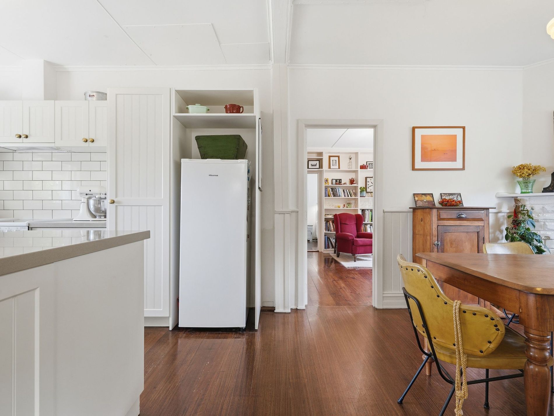 The main residence features an open-plan kitchen and dining area, with cabinetry and appliances updated in recent years. Original fireplaces remain a standout feature here, as well as in the adjoining lounge and sitting room, adding warmth and timeless appeal.