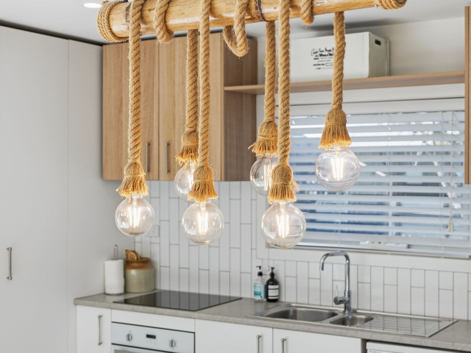- Well-appointed kitchen featuring induction cooktop, dishwasher, marble-look benchtops, soft-close cabinetry, double sink and modern downlighting