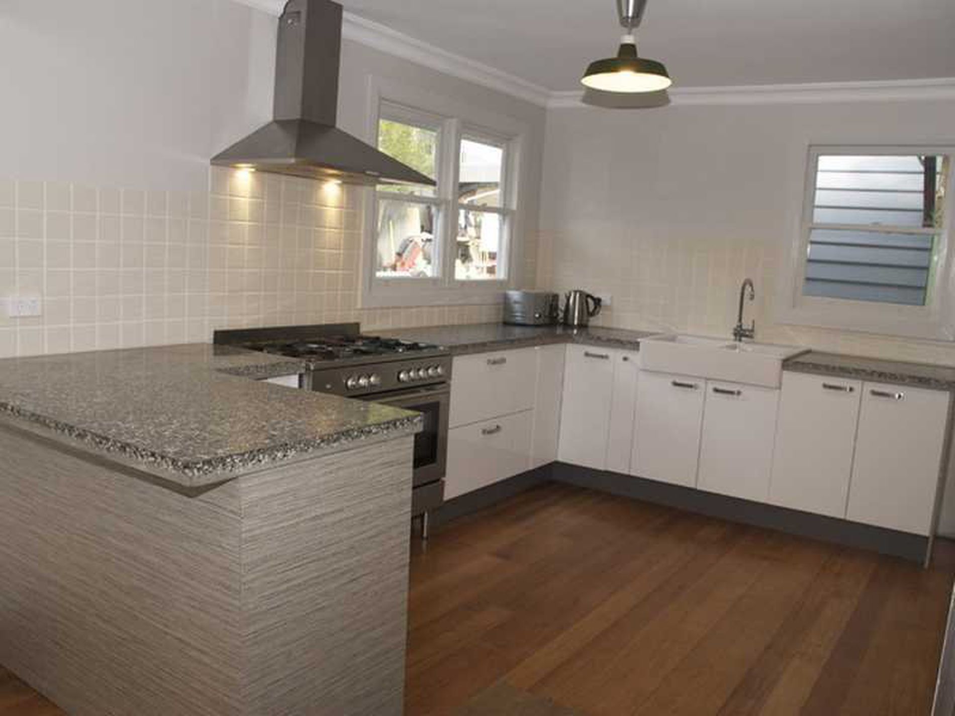 The gorgeous chefs kitchen includes a 900mm wide gas top freestanding stove, polished concrete bench tops and a ceramic butlers sink. From the open plan kitchen, dining and living you can look over the deck and see the sunrise over sleeping beauty. Both of the new decks look towards Snug tiers and the channel.