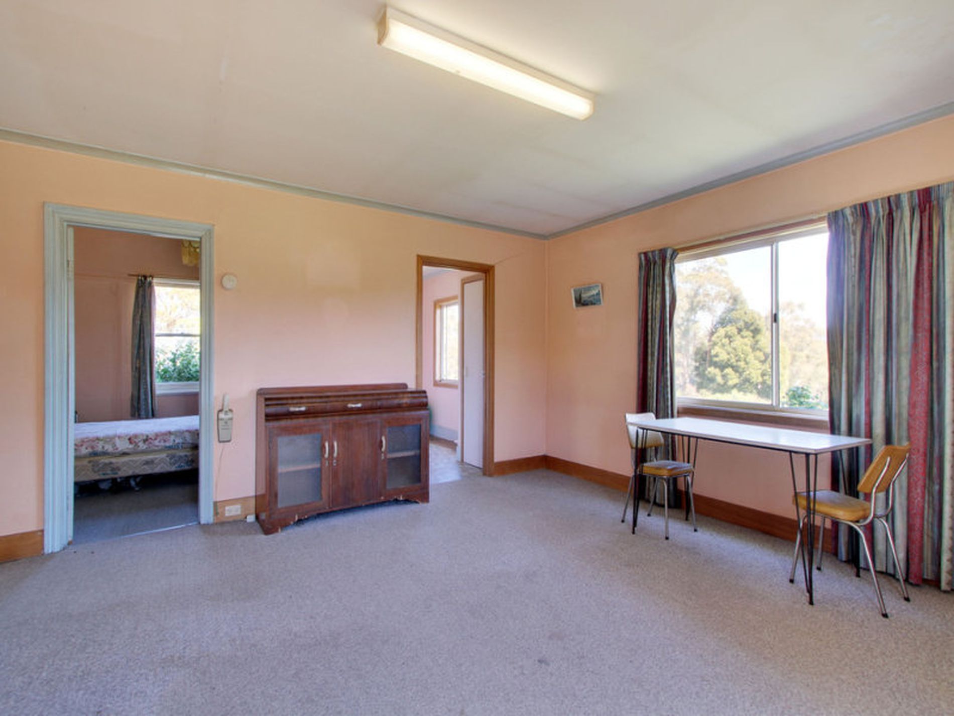 The entrance leads you into a spacious kitchen with walk in pantry that features the original wood burning stove and cooktop. The living and dining area currently offer the best of the views with an outlook over the pasture, through the dam and beyond to the bay.