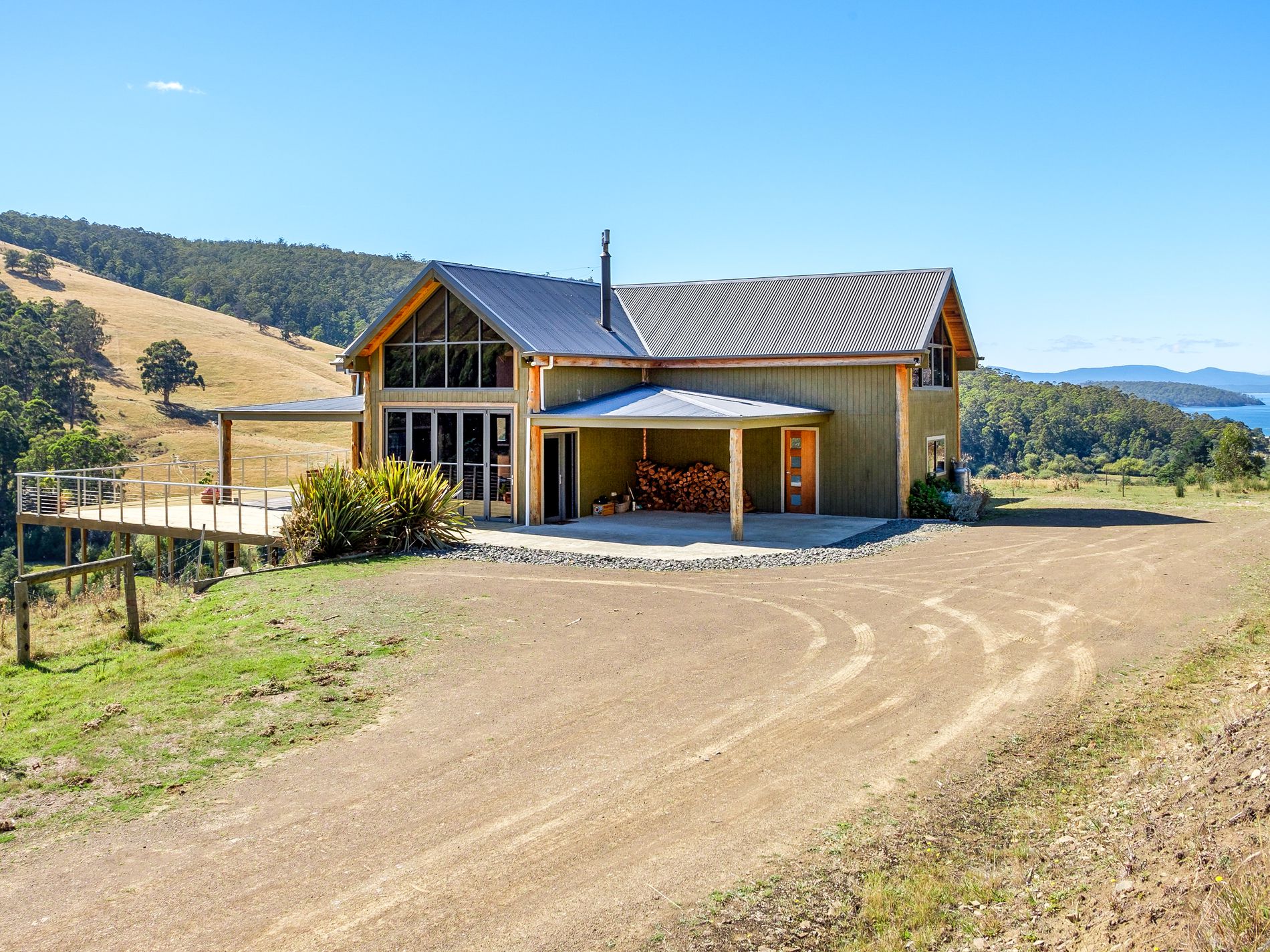 Exceptional opportunity to purchase this unique 2 storey home on approximately 3.4 acres of pasture with inspirational views over Dover Bay and islands beyond. Beautifully designed for relaxed open plan living this delightful home features 2 large bedrooms, master with walk in robe, cathedral ceilings, polished timber floors, wood heating, lots of sunshine and is set in an elevated position offering sweeping valley and bay views. Extensive use of glass throughout captures the mesmerising vista and floods the home with light.