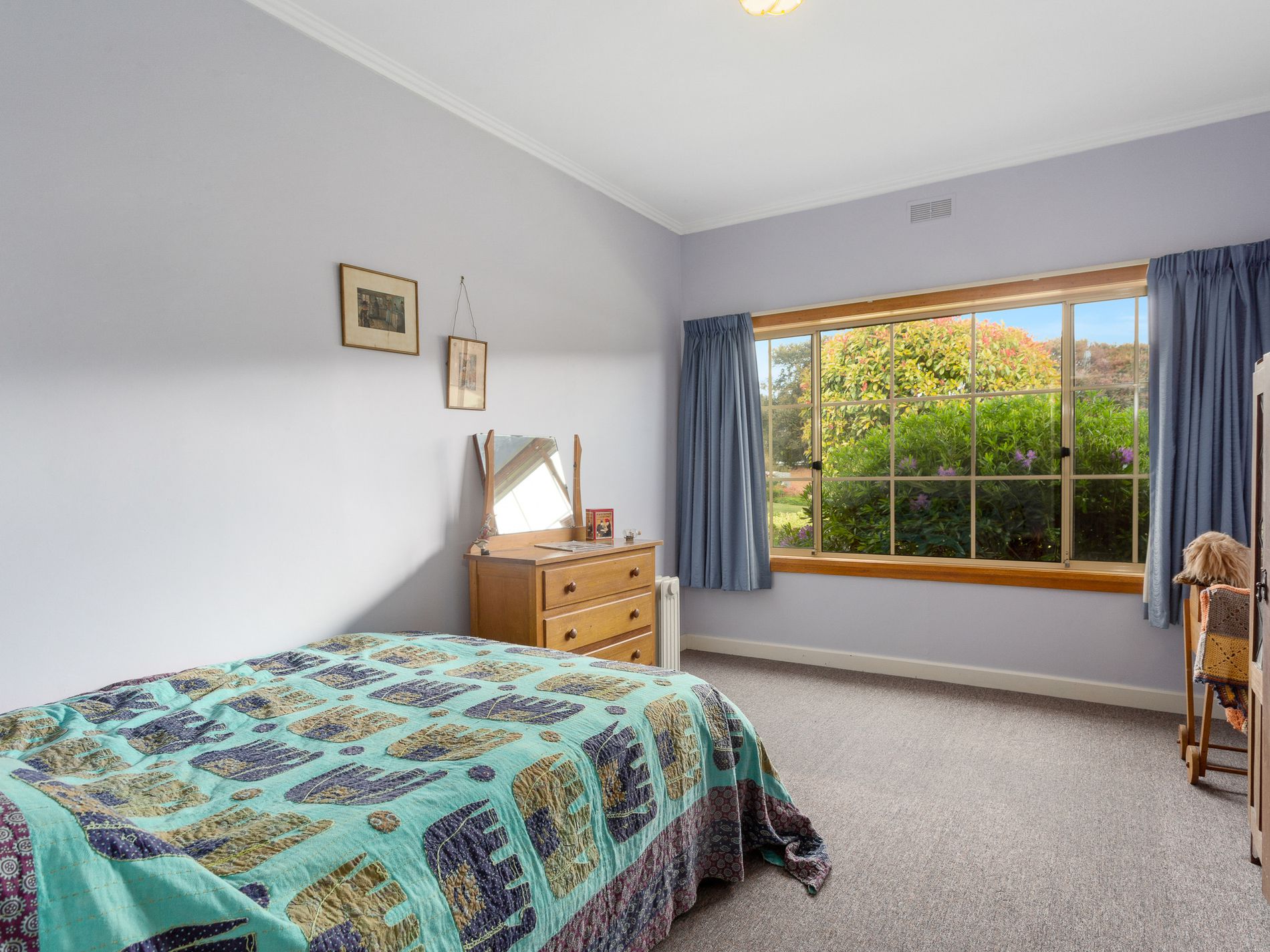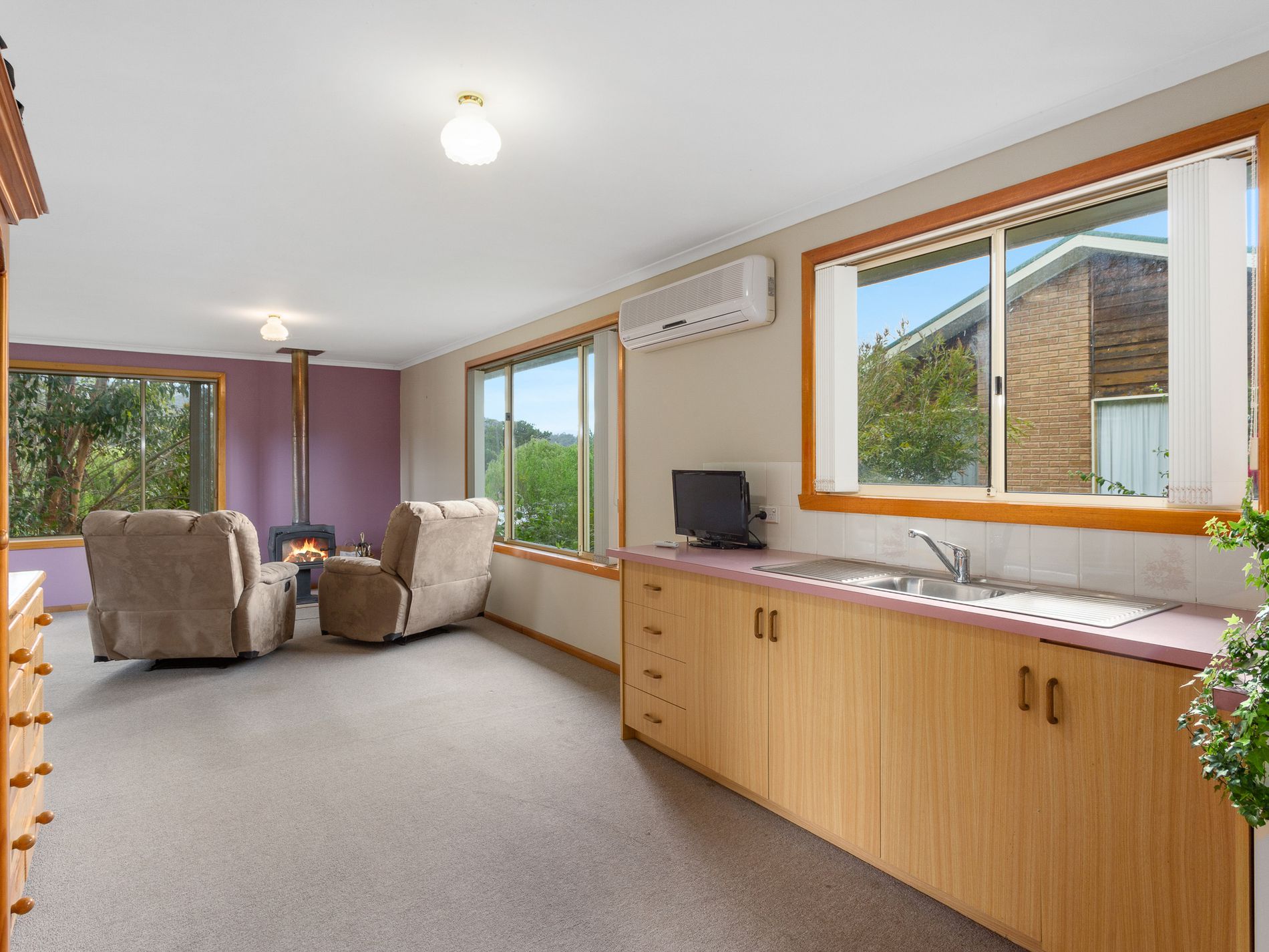 At the rear of the house is a completely self-contained guest suit which could also be enjoyed as a decadent master bedroom. This area offers a kitchenette, ensuite bathroom and an open, studio style, living and sleeping space. The wood heater and the reverse cycle, along with the Northerly aspect keep this space comfortable each season.
