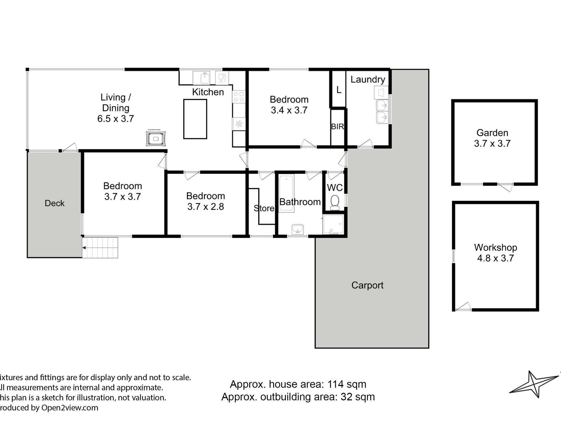 The entertaining deck at the front of the home overlooks the Huon River across the road, and enters the home into the loungeroom. The open plan lounge area offers large windows allowing sunlight into the home and all day rural river views. The central free standing wood heater is located between the lounge and the kitchen. The recently renovated modern kitchen offers beautiful timber bench tops and shelving, stainless steel oven with gas cooktop, dishwasher, walk-in pantry and an island bench which doubles as a breakfast bar for convenience. The three bedrooms are all well sized, with one offering a built-in robe and each boasts a delightful view over the Huon River or the gardens. The bathroom is located at the back of the home, and has a separate shower from bath, and a toilet located in the next room. The laundry room is accessed from the carport.