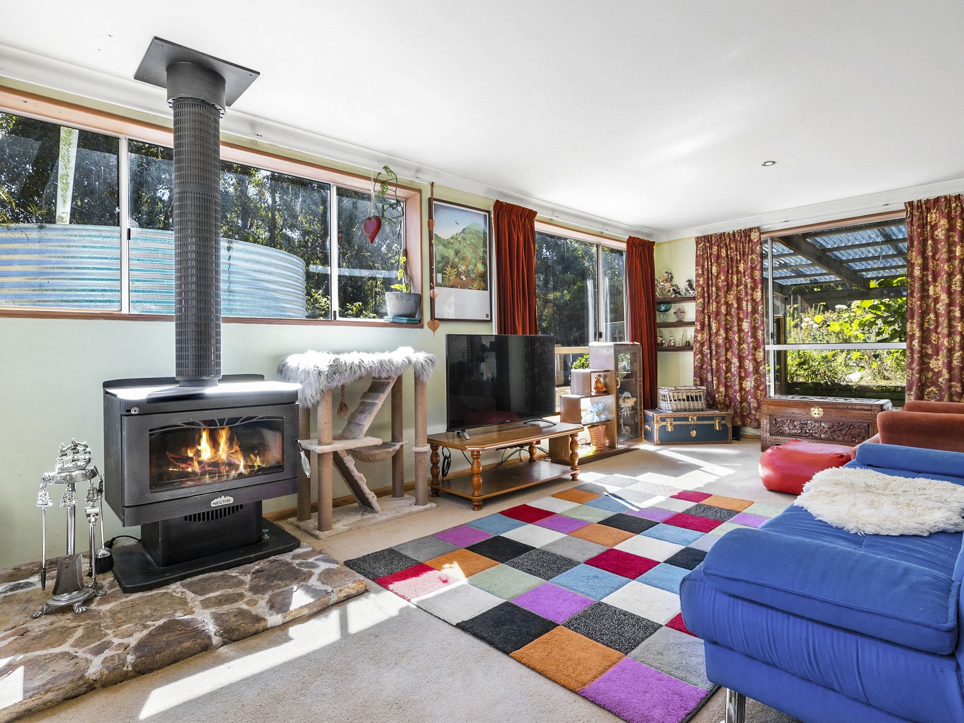 The ground floor provides a spacious living area with a wood fire and floor to ceiling windows which are a welcome and consistent feature throughout the home.